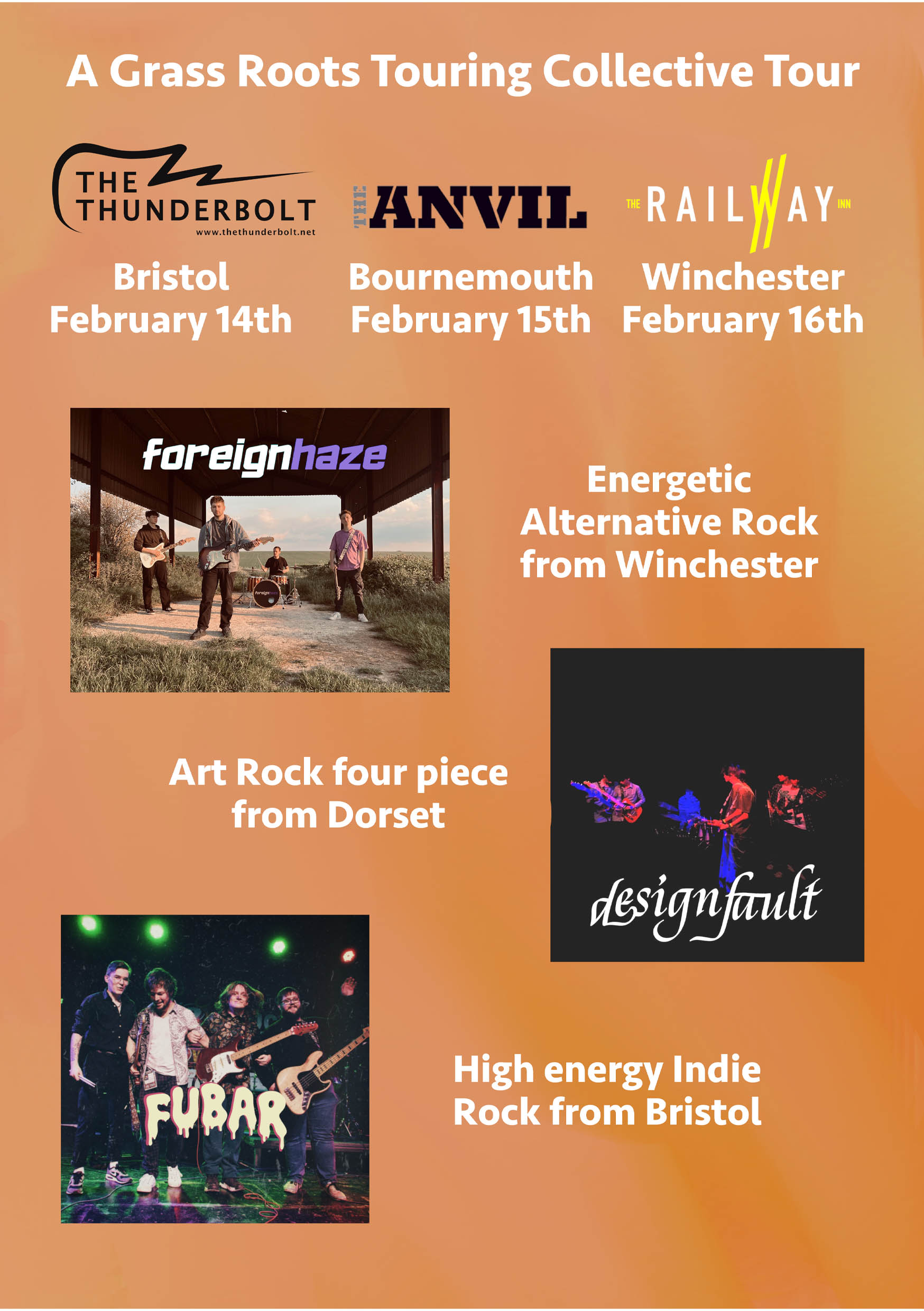 Design fault / Fubar / Throwing Distance will be heading out on a mini tour stopping off at the railway in winchester and the thunderbolt in bristol