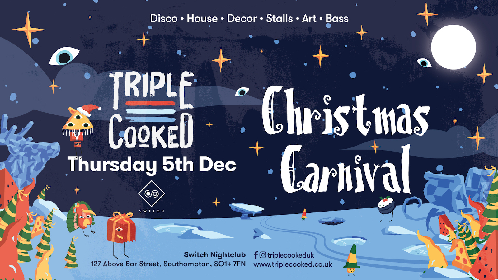 Travelling thousands of miles from the North Pole, the Christmas Carnival has arrived. A not so silent night, full of dancers, prancers, Christmas crackers, festive art and more. Triple Cooked returns for a snowy affair taking over the UK's most iconic venues and transforming these creative spaces into a winter wonderland. From live art to oversized Christmas decorations, to live music, disco, house and mid bookie snacks and more. Venture into the carnival this Christmas!