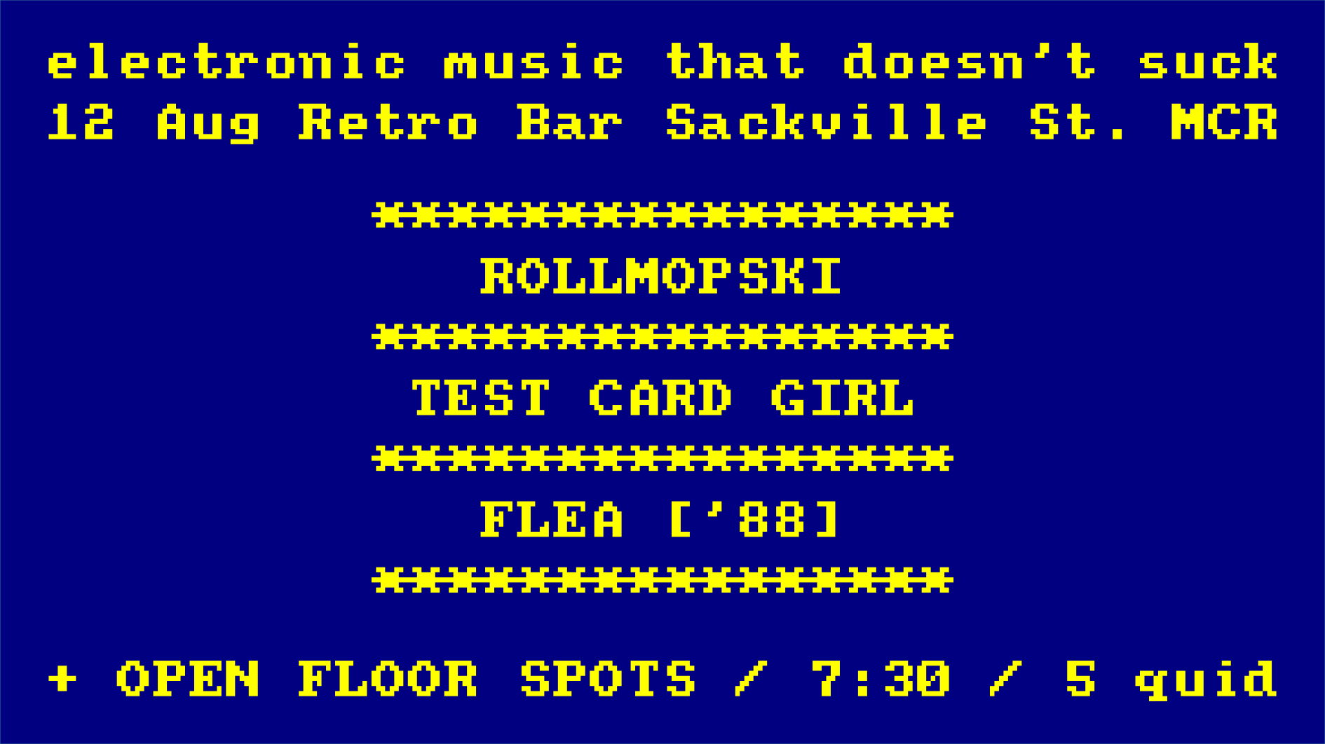 ROLLMOPSKI + TEST CARD GIRL + PLANET BOZ + open floor spots https://rollmopski.bandcamp.com/https://testcardgirl.bandcamp.com/https://www.facebook.com/bozhaywardmusicearly doors - 7:30pm / curfew 10pm£5 otd. or advance