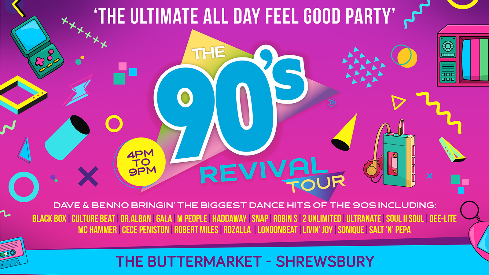 The 90’s Revival is going on Tour and it's coming to The Buttermarket in Shrewsbury. Get ready for this as we bring you the biggest tracks of the 90’s with Pop, R n B and Dance, we are sure to bring the memories and good times back. The music of a generation is brought back to life by our talented DJ’s and original Artists, you can be sure to reach for the stars as our DJ’s and Dancers give you a visually entertaining Show, whilst they take you on a trip back to the days that shaped your life. The 90’s Revival is a non-stop uplifting music extravaganza and features tracks by N-Trance, Baby D, Oasis, Pulp, The Spice Girls, 2 Unlimited, The Vengaboys, Ace of Base, Gina G and many many more.