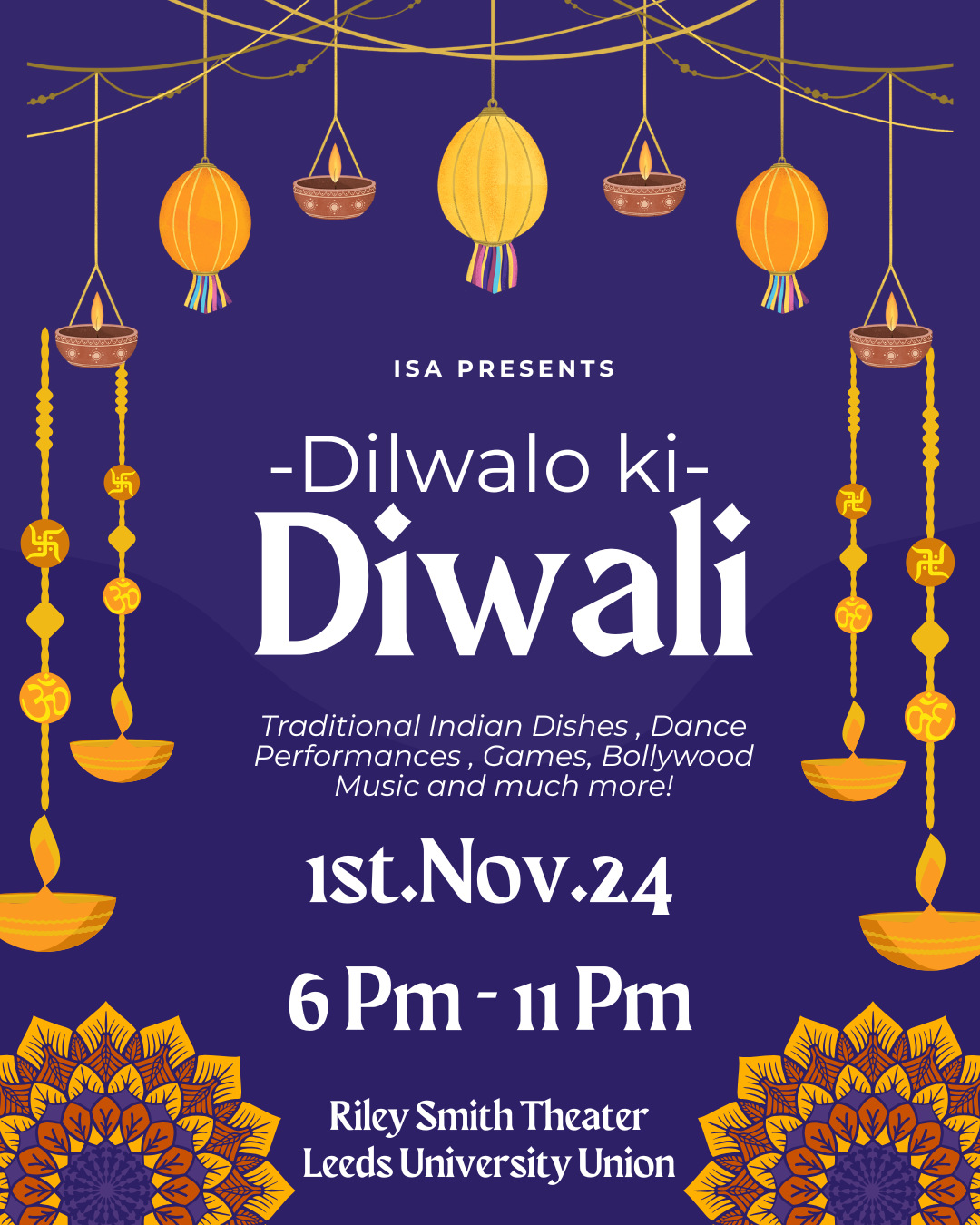 An event filled with unlimited food, bar, dance performances, game stalls, photo booths, and much more! It runs from 18:00 to 23:00 on 1st November 2024 at the Riley-Smith in the Leeds University Union.