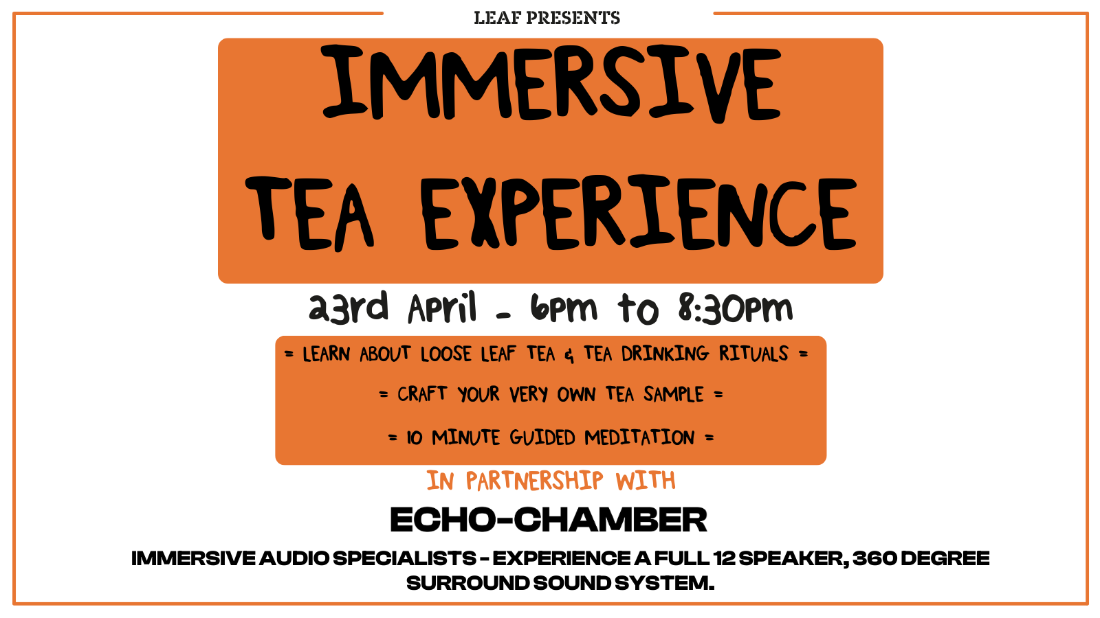 You’ll be able to craft and take away your very own custom tea sample with LEAFs extensive range of loose leaf teas. Art & craft supplies will be provided to facilitate a creative environment for attendees, all whilst being submerged in a state of the art 12 speaker surround sound system, provided by immersive audio specialists Echo Chamber.