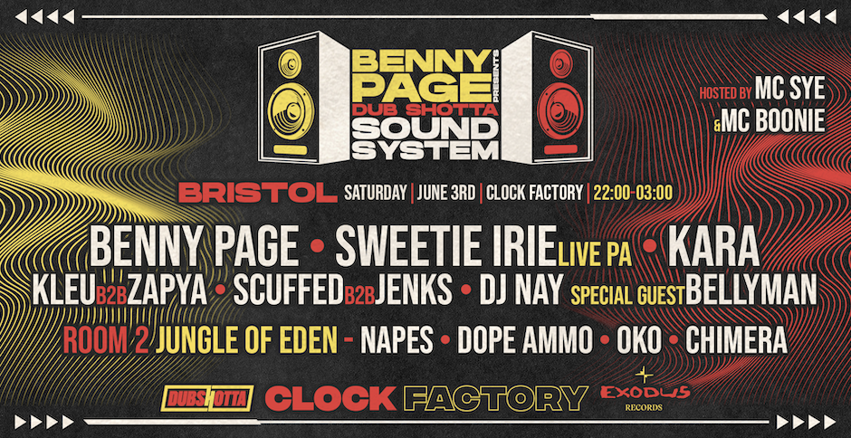 Benny Page, a true veteran of the scene, is set to bring his signature blend of ragga-infused sounds to the Clock Factory dancefloor. He's joined by Kara, a rising star known for her high-energy sets and eclectic selections, Kleu, whose unique take on jungle and drum n bass has been making waves across the UK, and Sweetie Irie, who will be bringing their LVE PA to the stage to round out the night. Room 2 is being curated by Bristol's own Exdous: Jungle of Eden.