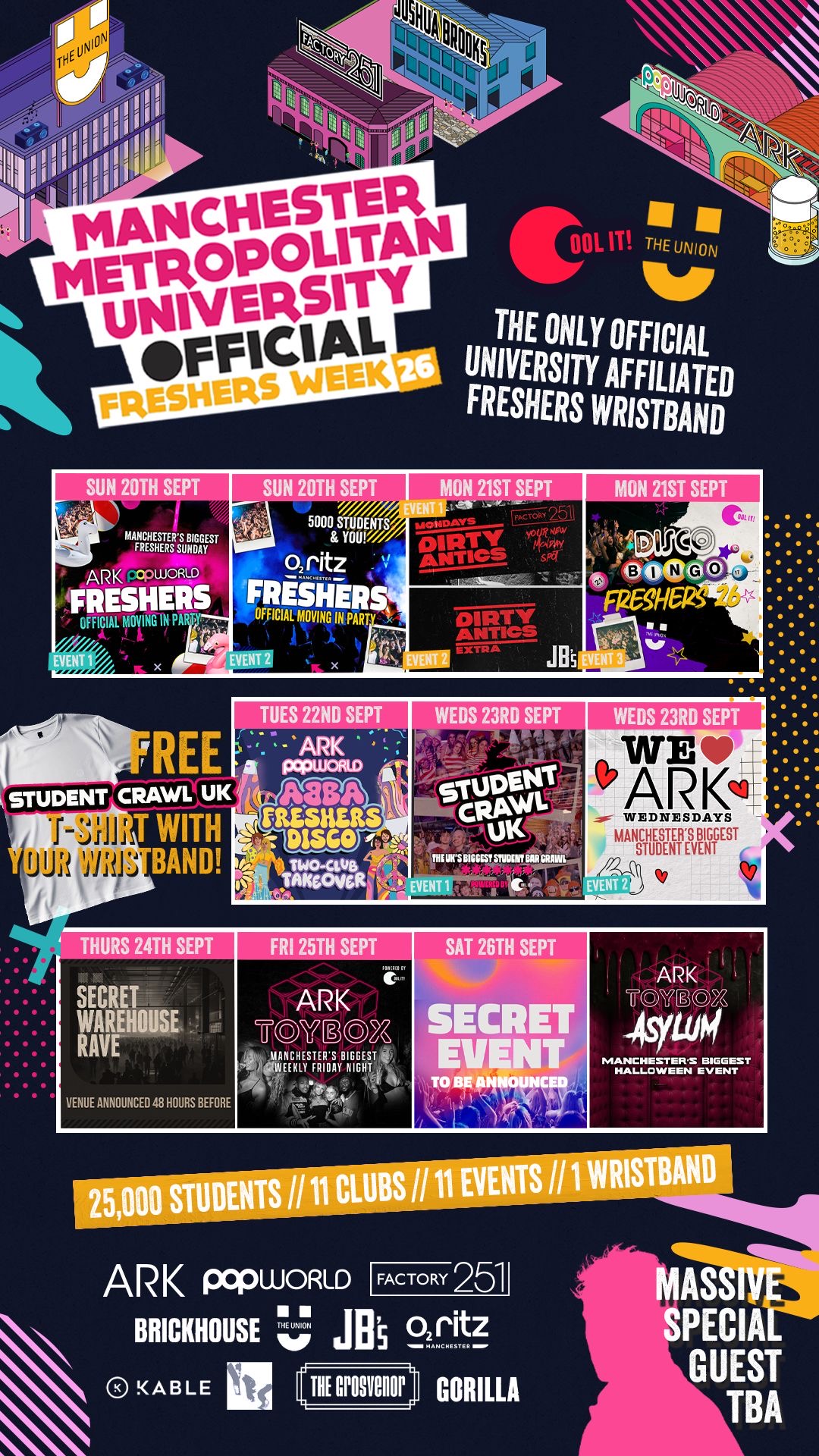 A: Manchester Met’s Official Freshers 2026 is the ONLY OFFICIAL University affiliated Freshers programme in the City, hosted in conjunction with your Students Union. As such you can be assured that all events will be operated to the highest level across the City's leading clubs and venues.