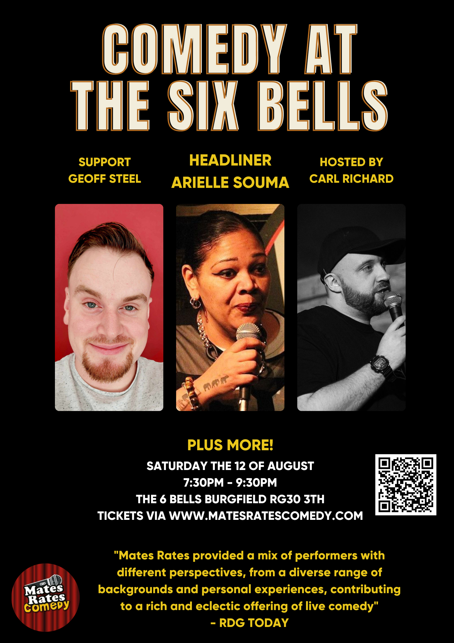 Stand Up Comedy is coming to Burghfield. Mates Rates Comedy is proud to present Comedy at The 6 Bells with headliner Arielle Souma.