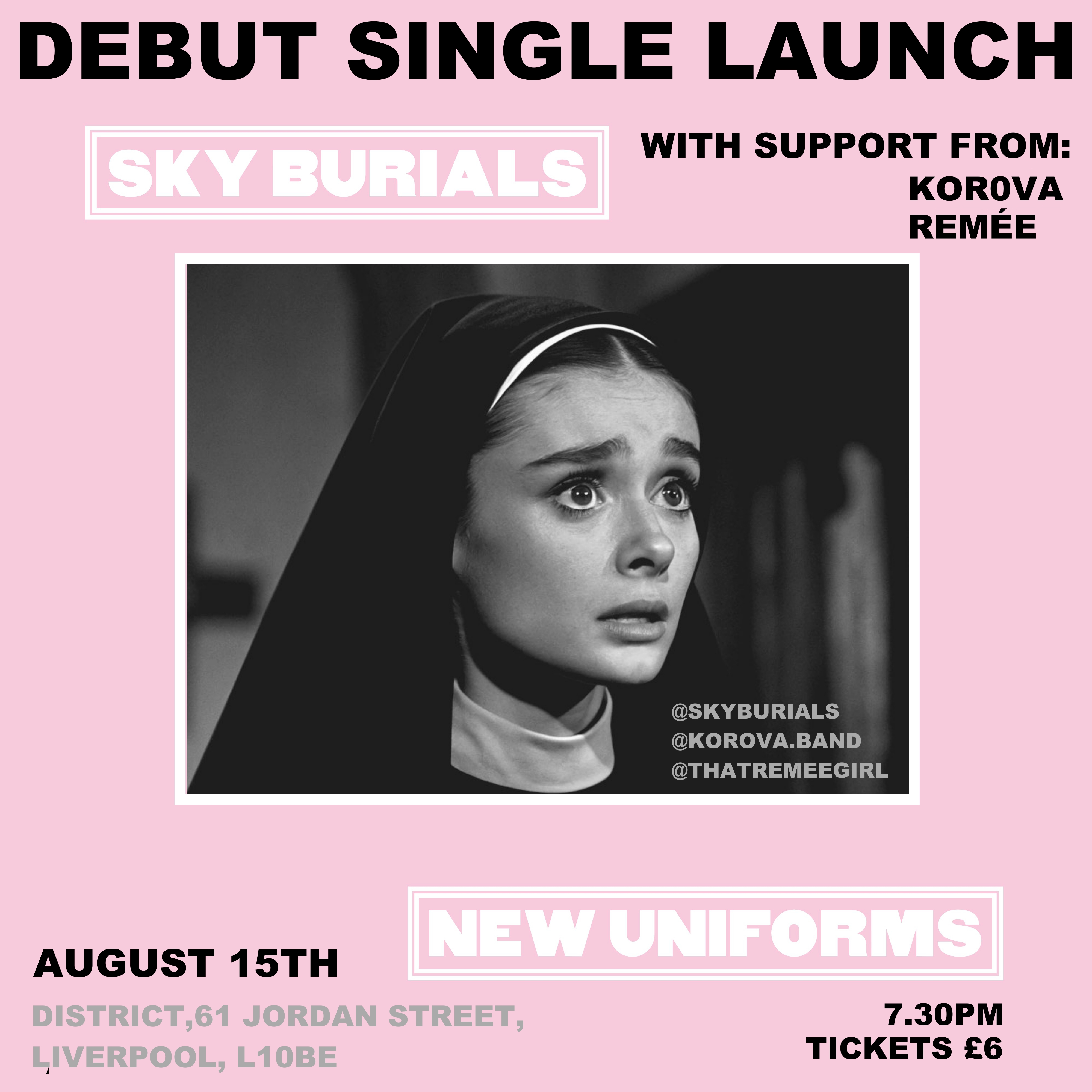 Art Rock outfit Sky Burials’ debut Liverpool concert at District is functioning as a debut single party. Their song New Uniforms will be released the same day, August 15th. Featuring support from Korova, Remée and Loco Ono. Tickets £6, doors 7pm.