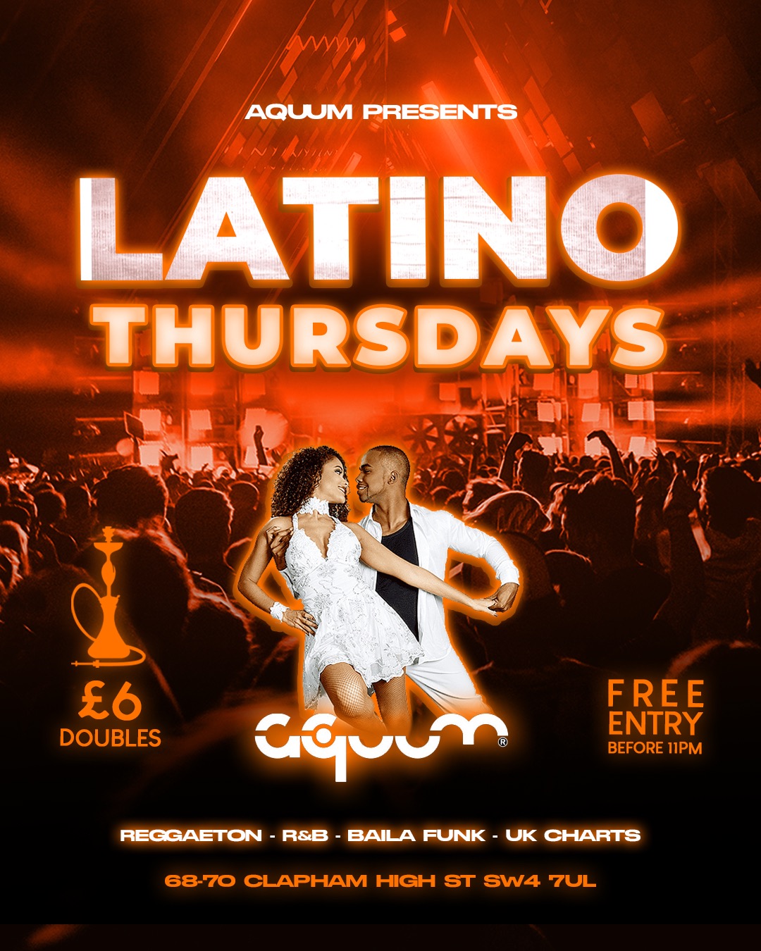 The Most Vibrant Latin Party Awaits You Every Thursday At One Of Claphams Most Exclusive Clubs AQUUM, Party The Night Away With Our Special Guests DJs, Live Music/Entertainment, CO2 Cannons, Hora Loca and Much More.