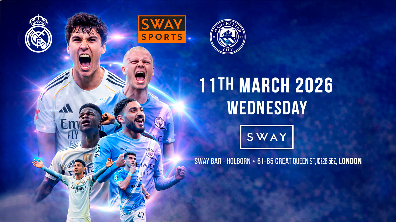 Watch the huge clash Real Madrid vs Manchester City live at Sway Bar with an amazing football atmosphere. Big screens, great music, cold drinks and fans ready for one of the biggest games in Europe.