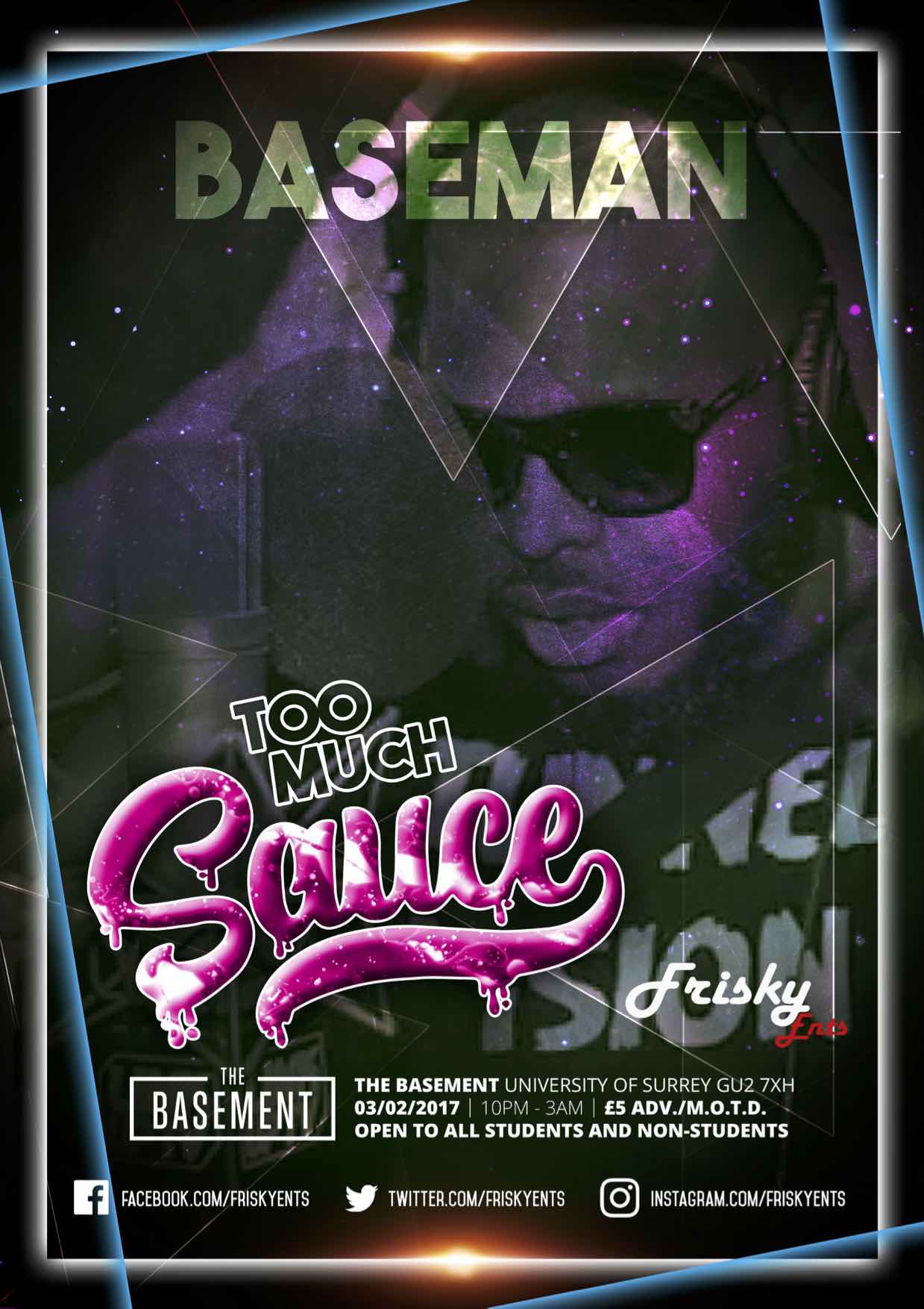 Too Munch Sauce at the Basement this Friday will be the biggest urban event in Surrey Playing the best in all things Urban including Bashment, Afrobeats, Hip Hop, RnB, Grime and much much more. With some of the biggest DJ's in the country playing alongside some of Surrey's Finest!
