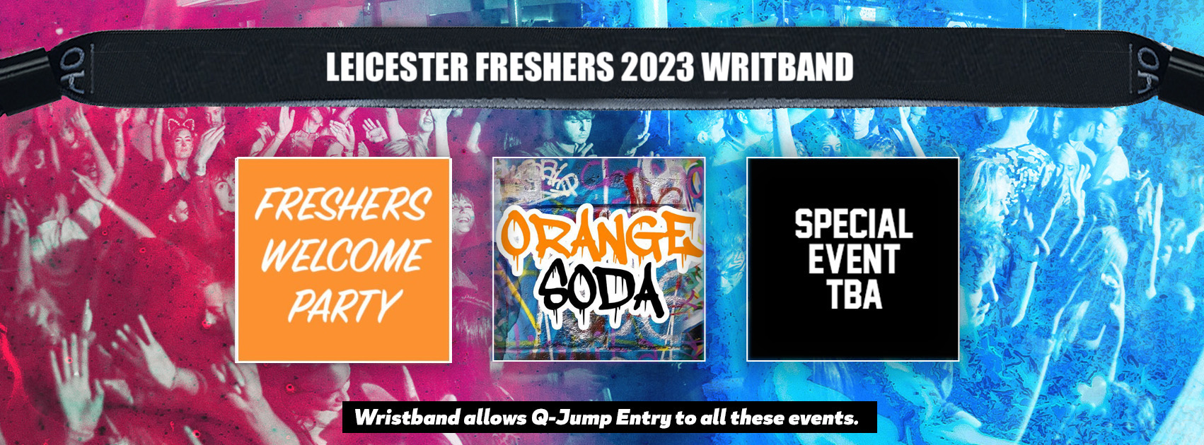 The ultimate Freshers Wristband which gains you Q-Jump access and entry to 3 of the biggest Freshers Events.. The legendary Freshers Welcome Party, The 00s Throwback R&B Special and a special event TBA!