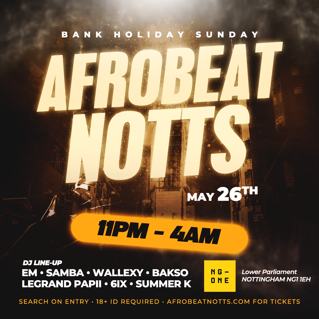We're putting on an exceptional Afrobeat Notts edition at Nottingham Superclub NG-One. We've enlisted a top DJ Line-up with a host of surprises. Expect our usual best, but bigger, better and for longer. We will party till daylight! Advance tickets and table bookings are strongly advised. You don't want to miss this!