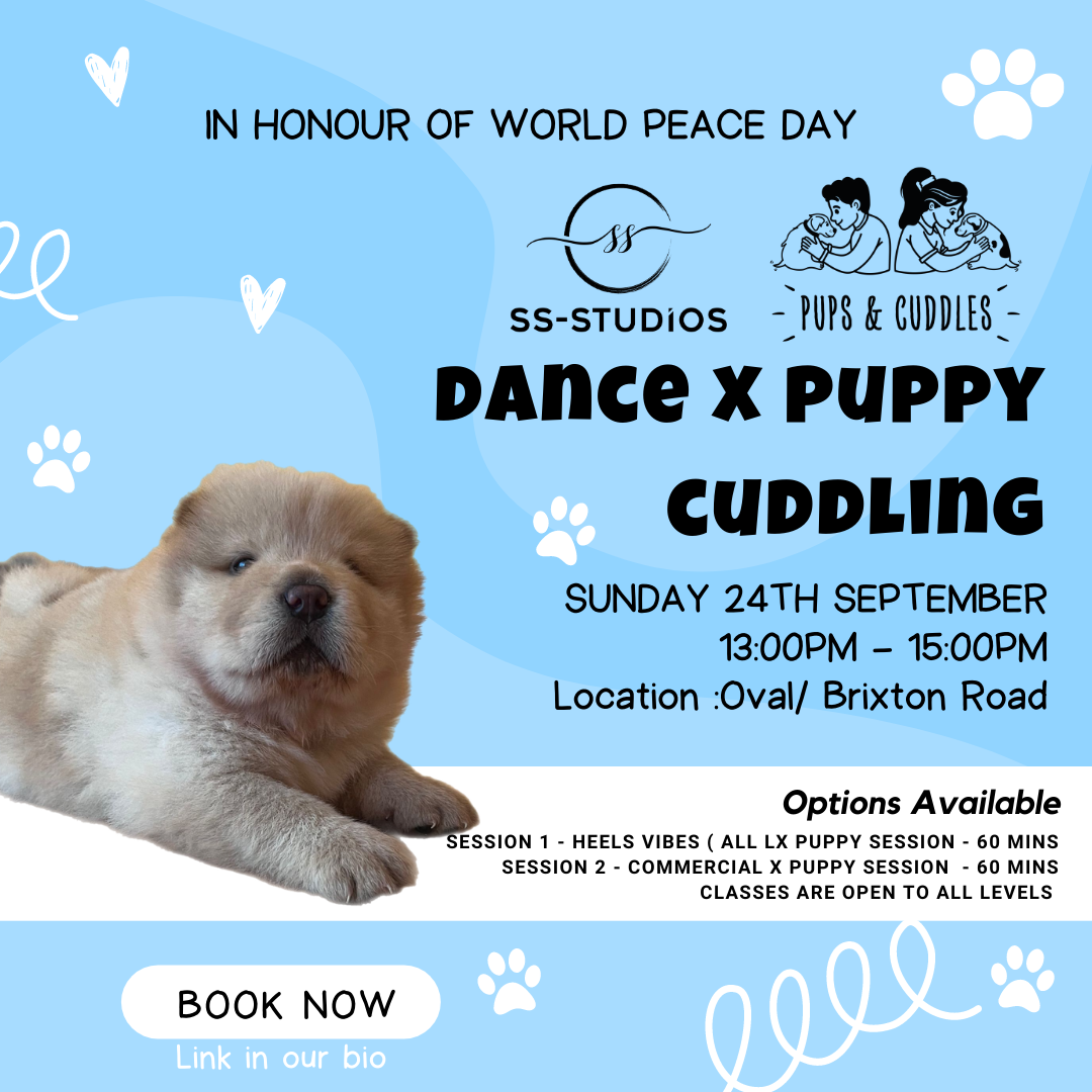In celebration of world peace day ss-studios and Pups & Cuddles are joining forces to bring you a wholesome, and movement based workshop. ss-studios will be holding a fun and interactive dance class followed by a therapeutic downtime and relax session with pups and cuddles. Whilst ensuring the puppies are safe , happy and healthy during all sessions, this will be a relaxing session please keep noise to a minimum during this time to respect the puppies. We will run you through a short briefing before introducing you to the puppies and the DOs and DONTs during each session.
