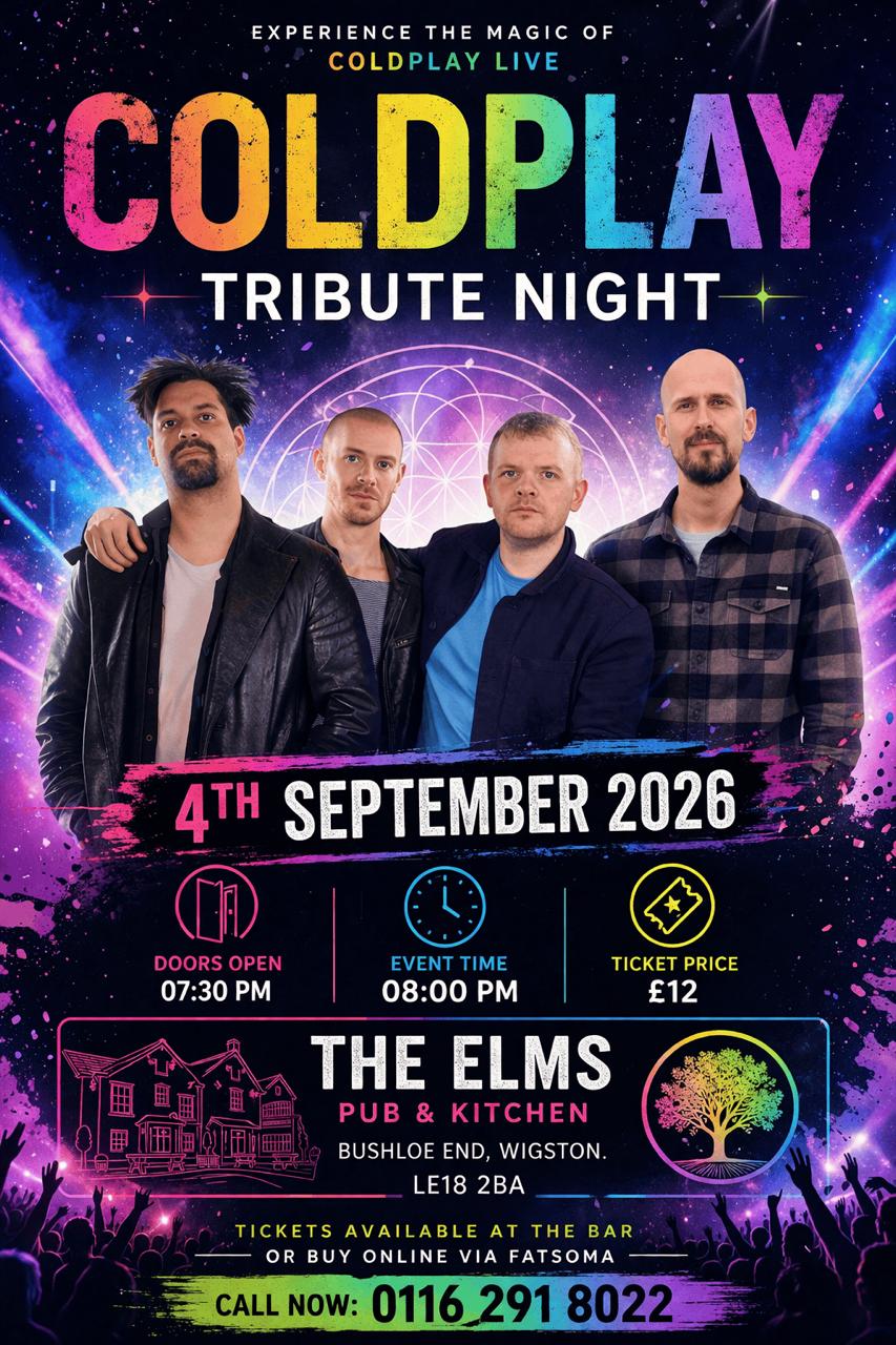 Get ready for an unforgettable night as we bring you a spectacular Coldplay Tribute Night at one of Wigston’s favourite venues – The Elms Pub & Kitchen!