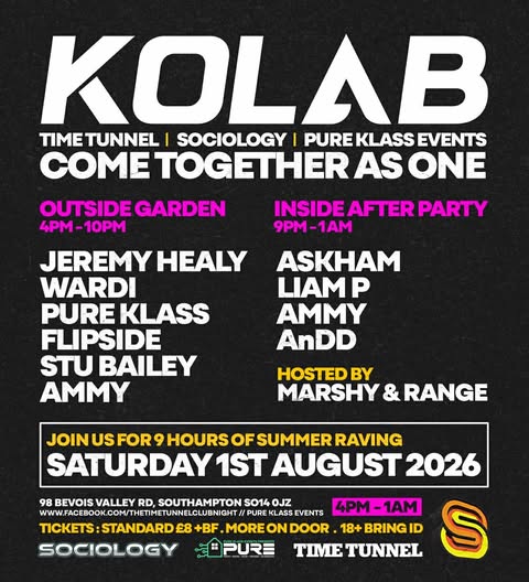 KOLAB COME TOGETHER AS ONE WITH TIME TUNNEL, SOCIOLOGY, & PURE KLASS EVENTS BRINGING YOU A NEW VIBE TO SOUTHAMPTON. WE START WITH A GARDEN PARTY AT SOBAR.