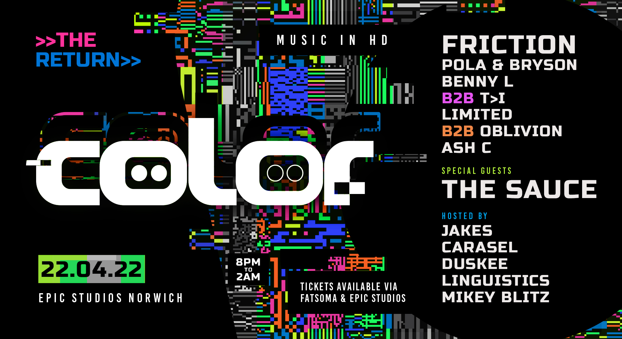 The Return. A full Color assault on the senses. Spanning the spectrum of dnb to bring the very best to Epic Studios, Norwich.