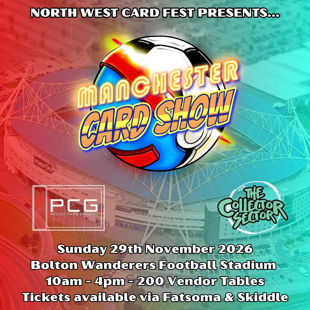 North West Card Fest presents the return of Manchester Card Show to Bolton Wanderers Football Stadium!! 200 vendor tables full of binders, graded cards and super hard to find sealed product. Our last event was phenomenal for the North West & UK hobby and this event will be no different! Tickets are available now via Fatsoma & Skiddle and if you'd like to vend now is the time to get in touch!! Pokémon, One, Sports Cards, Magic The Gathering & more..