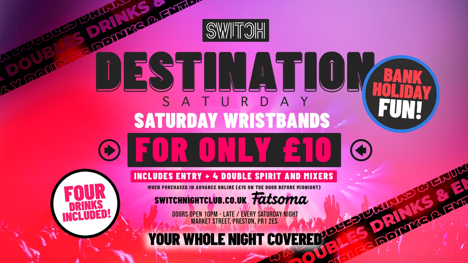 £10 WRISTBAND (IN ADVANCE) includes / ENTRY + 4 X DOUBLE SPIRIT AND MIXERS