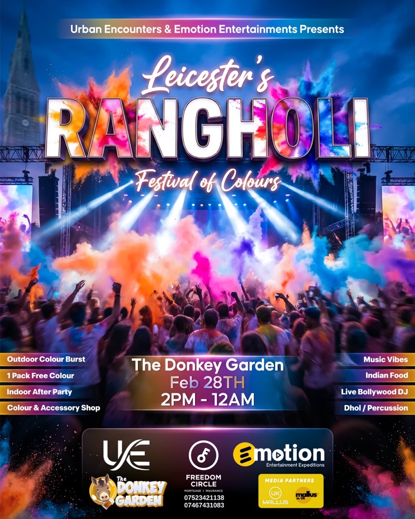 We are bringing back Leicester's vibrant 2 in 1 Rang Holi family outdoor celebration at The Donkey Garden! Experience the joy of Holi, the festival of colors, in a lively outdoor setting from 2:00 PM to 6:00 PM. Safe, organic colors will be provided for all participants, ensuring a fun and safe celebration. One Complimentary Colour packet provided at the Gate. Kids below 10 goes free.