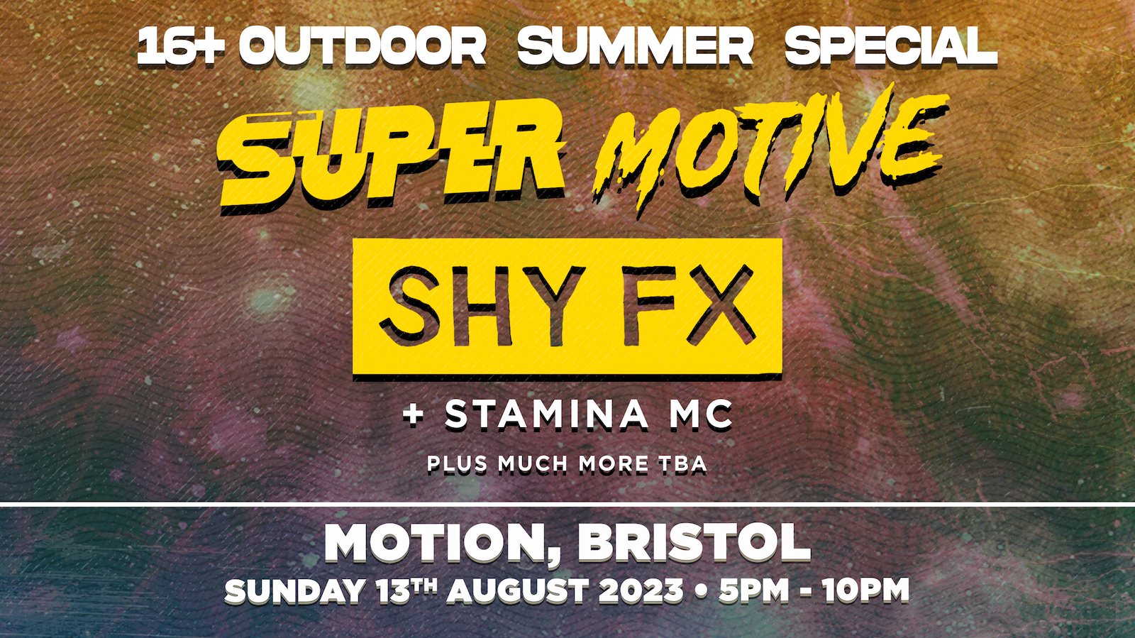 Motive & Super Sonix presents SuperMotive. The 2 biggest 16+ brands in the UK link up for a monster outdoor rave at Motion w/ Shy FX!