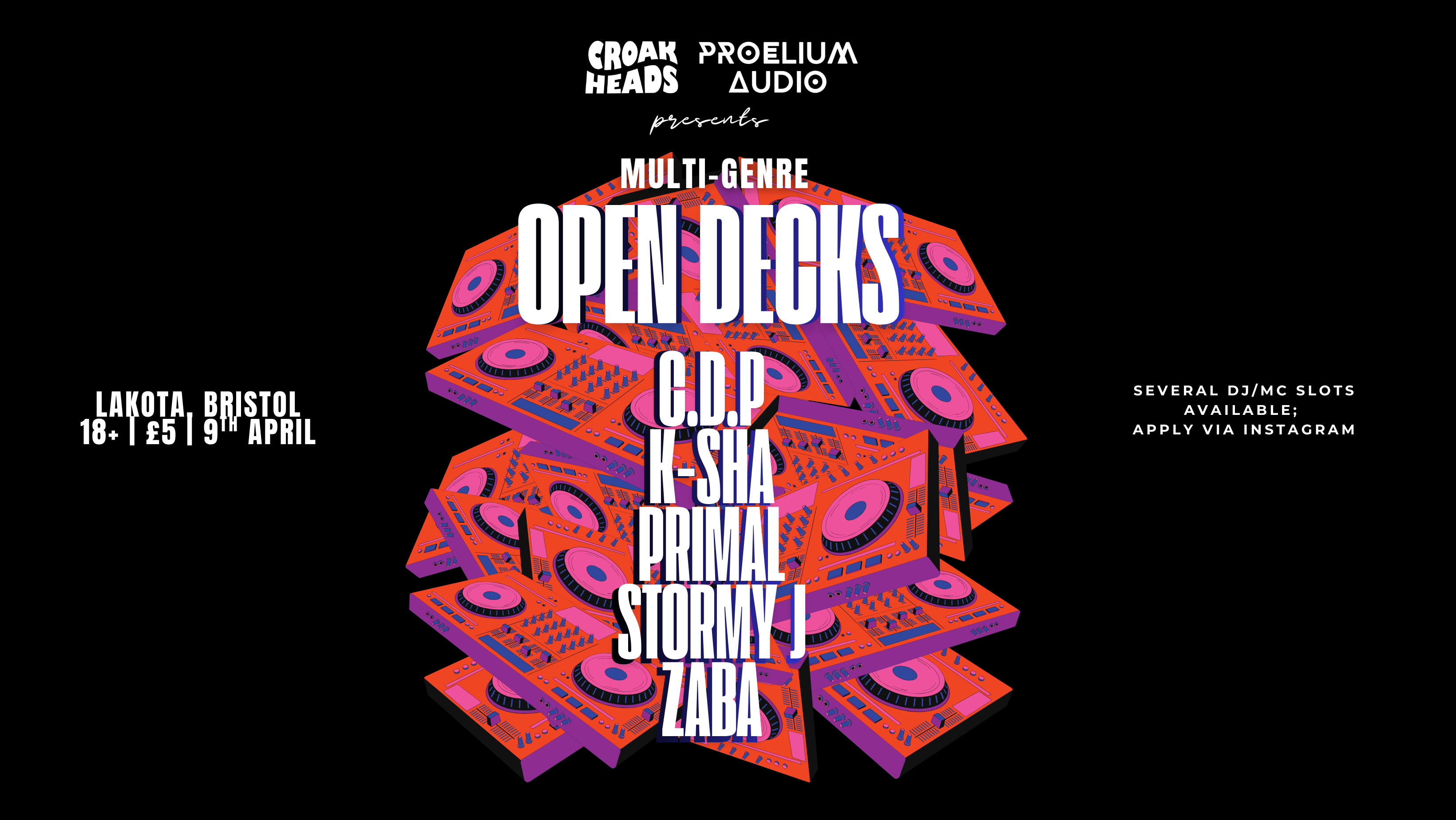 Croakheads and Proelium Audio would love to welcome you for an exciting night of multi-genre sets at our Lakota Open Decks - featuring local, grassroots champion DJs who actively support the Bristol community.