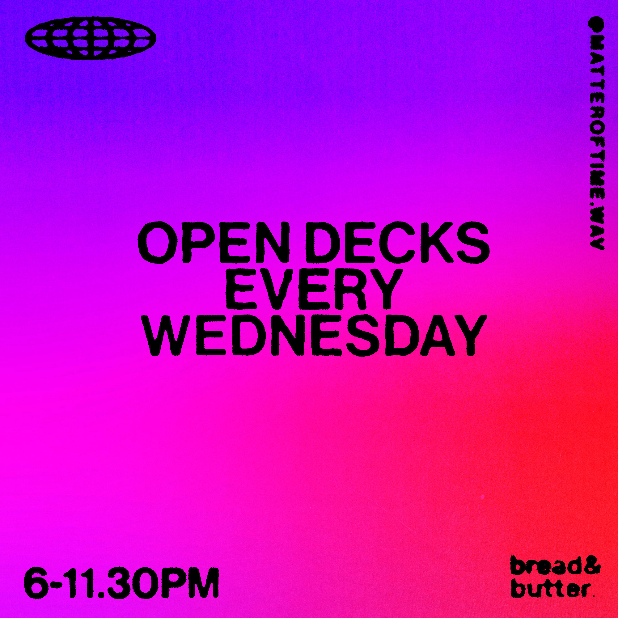 Join us at Matter of Time Studios for weekly Open Decks in collaboration with Bread & Butter — an opportunity for DJs of all skill levels to showcase their talents, spin their favourite tracks, and connect with fellow music enthusiasts.