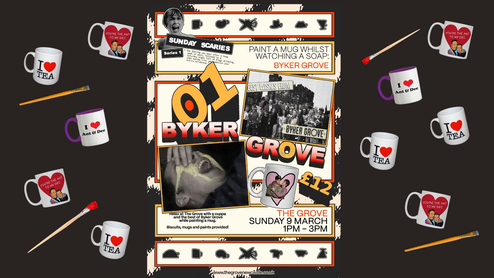Relax at The Grove with a cuppa or cocktail and enjoy the best of the Geordie TV series, Byker Grove, while you get creative and paint your very own mug!