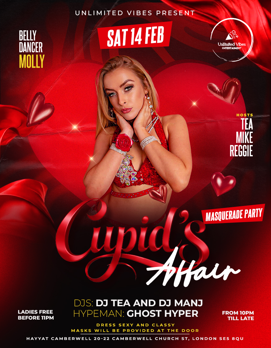 This is your invitation to dress to impress—sexy and elegant is the theme. Think glamorous masks, sleek outfits, and statement looks that turn heads the moment you arrive. Whether you’re coming with a date or ready to mingle, Cupid’s arrows will be flying in a space designed for connection, fun, and unforgettable energy.