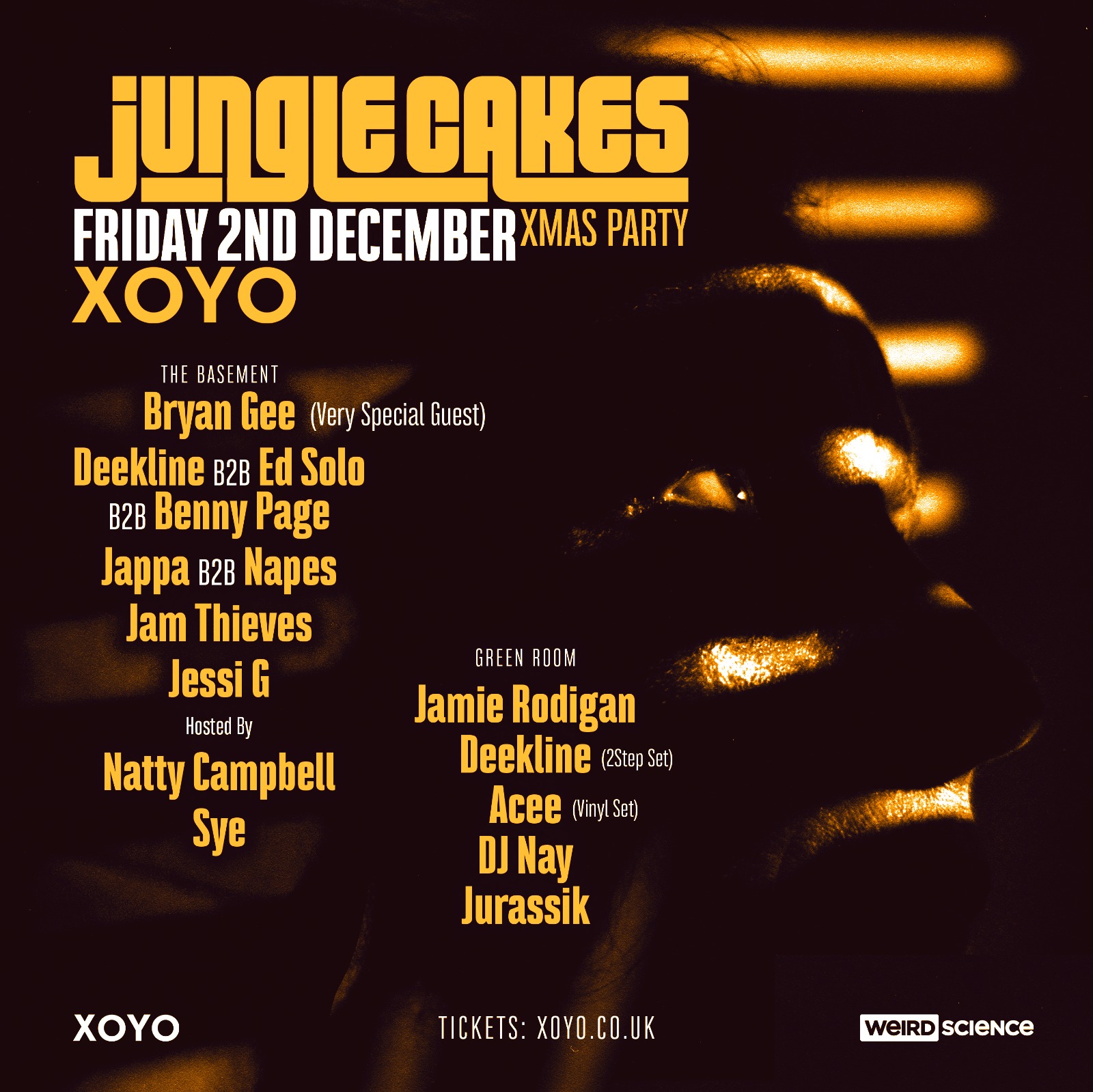 Fire up the klaxons and get primed for a festive junglist bangarang hotter than the seasonal goose’s giblets and ruffer than your nan after one too many office Christmas parties.September’s XOYO debut was so off the hook we’re bringing our annual Jungle Cakes Xmas Party to Shoreditch’s coolest space. Joining label head honchos Ed Solo and Deekline this time around will be the big man Benny Page, junglist young gun and man-of-the-moment Napes, Brazil’s mighty Jam Thieves, the incredible Jappa, queen of the jungle Jessi G and Very Special Guest Bryan G. In XOYO’s upstairs room we’re going eclectic with dancehall and raggamuffin jungle from Jamie Rodigan, an exclusive 2-step set from Deekline (who most definitely never smokes da reefa) DJ Nay, Acee and Jurassik. See you down the front and don’t forget your Santa hats for what promises to be a festive festival of raggamuffin pressure and breakneck culture vibes.