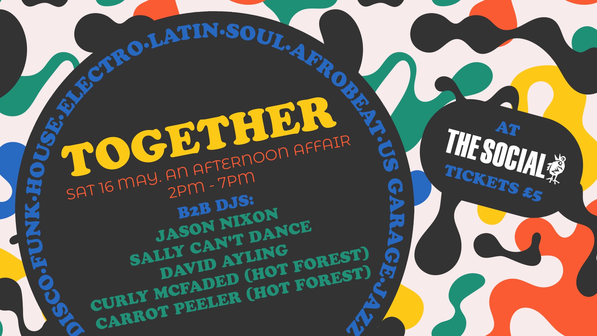 Together is back at The Social for its second day club. Together is a collection of friends, co collaborators and you. On this program you will hear Gospel and Funk, Disco, Soul, Latin, African, House, US Garage, Electro and jazz. Guest Disc Jockeys playing along side Mark and Jason this session will be David Ayling who is back for round two. We have also managed to team up with Hot Forest who are straight out of Southend, Curly Mcfaded and Carrot Peeler. In keeping with the event these cats will be playing back to back, expect to hear choicest of cuts and rarest of grooves. We're gonna have a good time, we're gonna have a party, away baby, let's go!