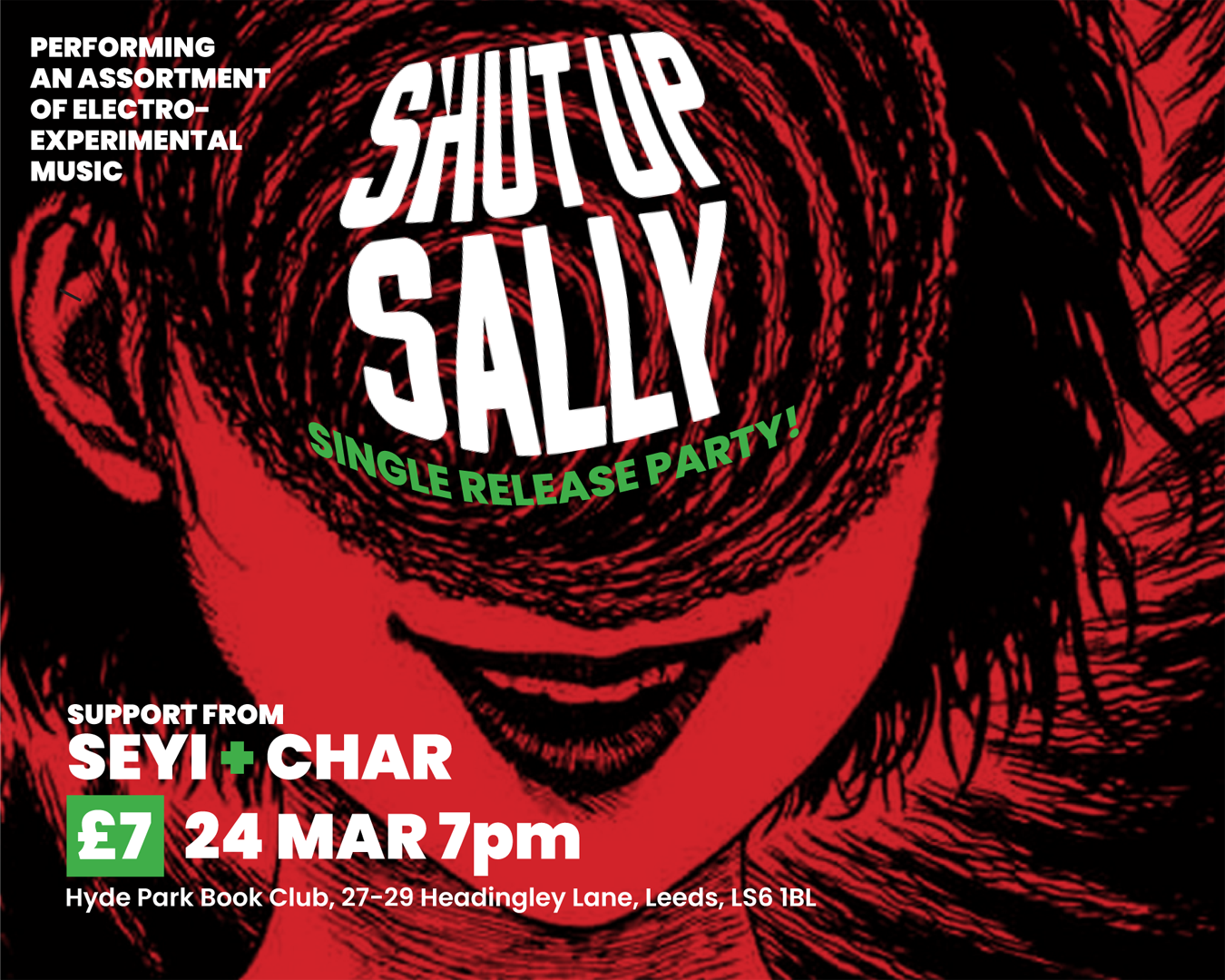Live music event celebrating Shut Up Sally’s debut single with support from Seyi + Char. Hosted at Hyde park book club (basement) on the 24th March.