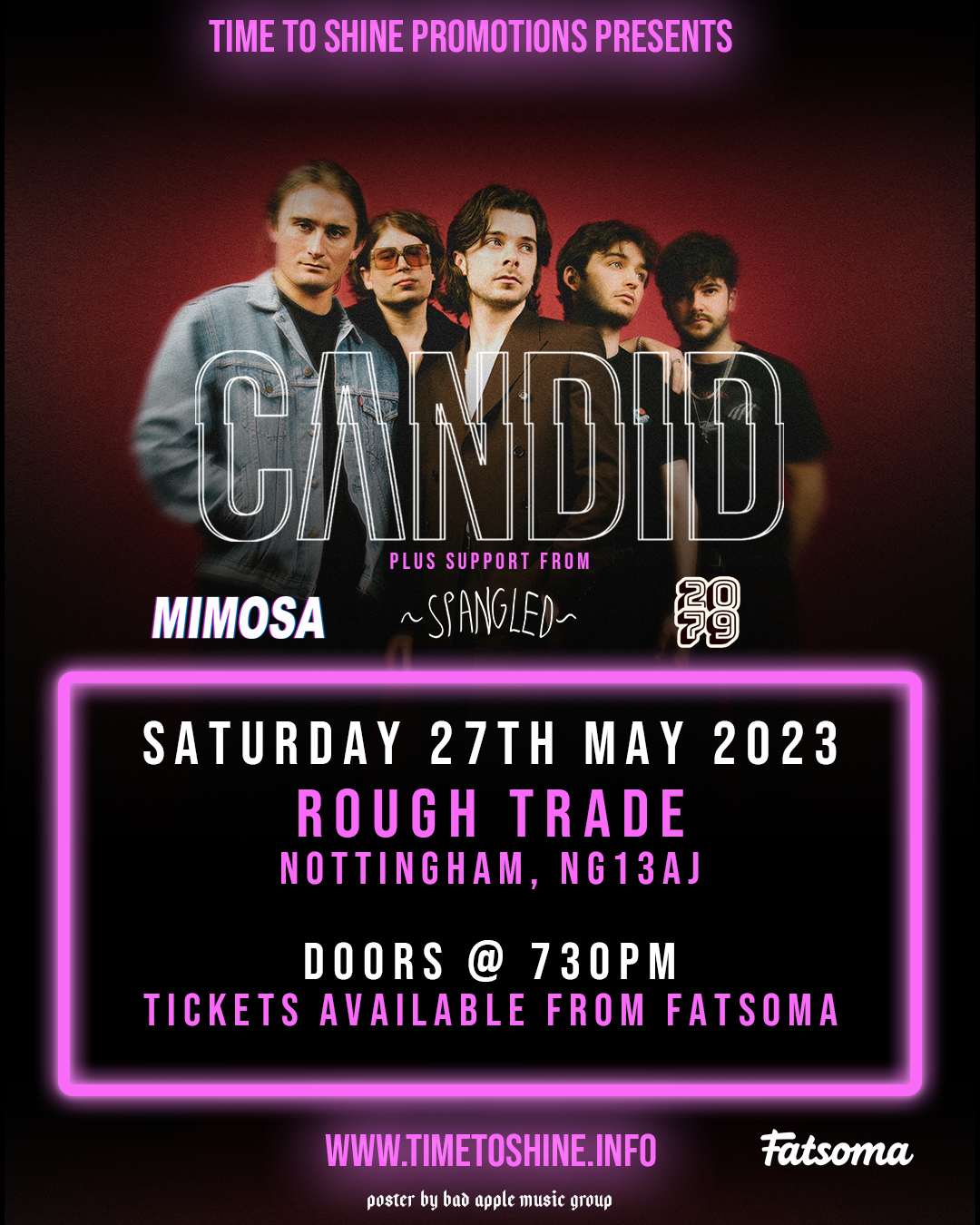 Candid deal in a brutal emotional honesty funneled through songs as sharp as they are soothing. Searing guitar riffs, irresistible drumbeats and a backbone of honest, unreserved lyrics deliver a commanding live show, not to be missed. After 3 hometown sell-out shows and an impressive string of support slots including Scouting For Girls, The Hoosiers and The Pale White; Candid’s infectious indie rock has won the hearts of the local music scene with an unchained drive to take their music to the next level.