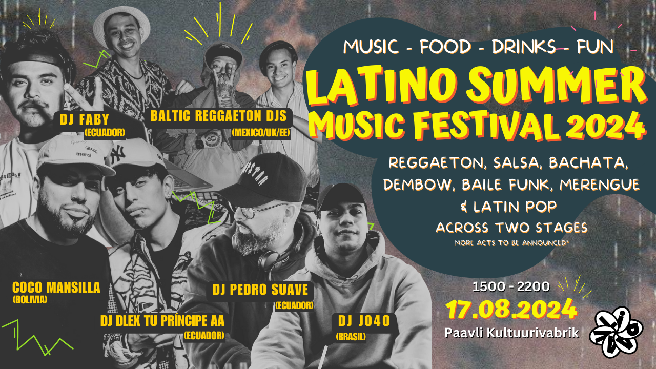 Special guest DJ Faby (Ecuador) DJ Pedro Suave (Ecuador) Coco Mansilla (Bolivia) DJ DLEX Tu Príncipe AA (Ecuador) DJ Carlos (Mexico) DJ JO4O (Brasil) and Baltic Reggaeton DJs playing Reggaeton, Salsa, Bachata, Dembow, Baile Funk, Merengue and more across TWO STAGES all day long!