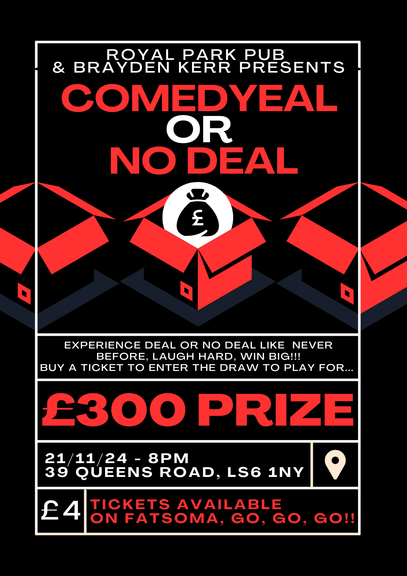 Deal or No Deal like you've never seen before, the game we all know and love hosted and presented by stand up comedian Brayden Kerr, one audience member will be selected at random to play Deal or No Deal for a prize of £300, twists and turns await the contestant as well as the audience as this game of Deal or No Deal involves spectacular improvised comedy, wild antics and ludicrously high stakes.