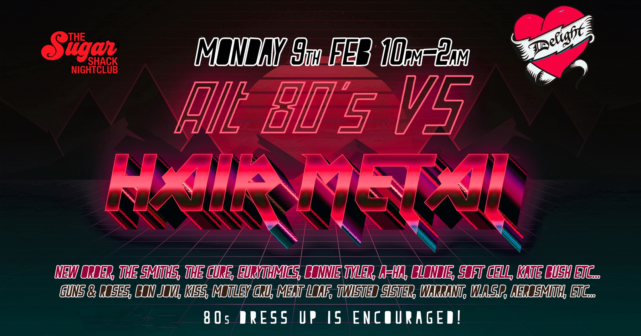 Next Monday at Delight we’re throwing the ultimate Alt 80s VS Hair Metal showdown; a no-rules collision between post-punk, new wave and goth icons versus sunset-strip Spandex sleaze, arena riffs and fist-pumping anthems.