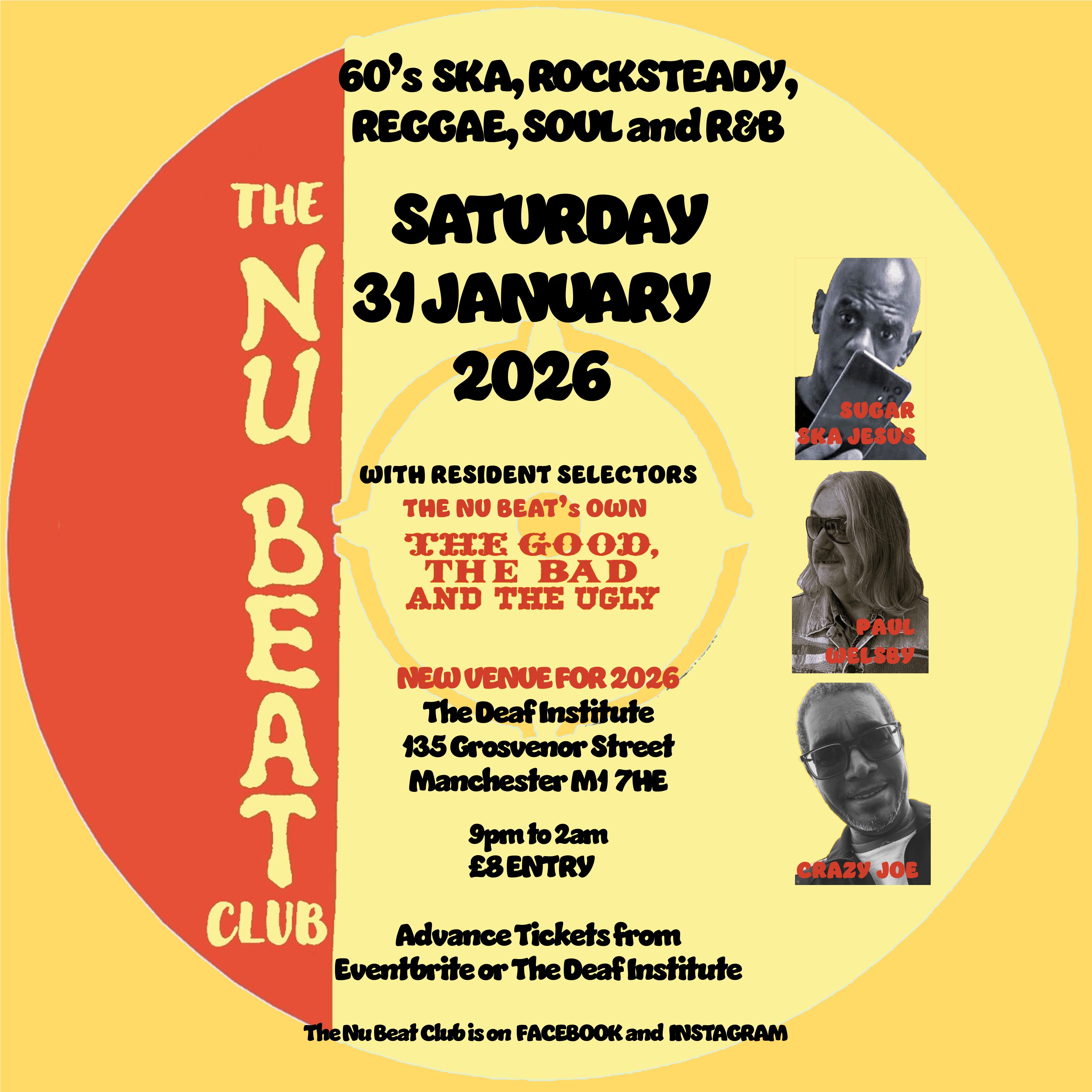 Established in 2013, The Nu Beat Club is a long running Manchester club night specialising in a patented dancefloor friendly mix of rare 60's Jamaican Ska, Rocksteady and Reggae together with rare 60's US Soul and R&B. All played on original vinyl by resident DJs Sugar SkaJesus, Paul Welsby and warm up man extraordinaire Crazy Joe.