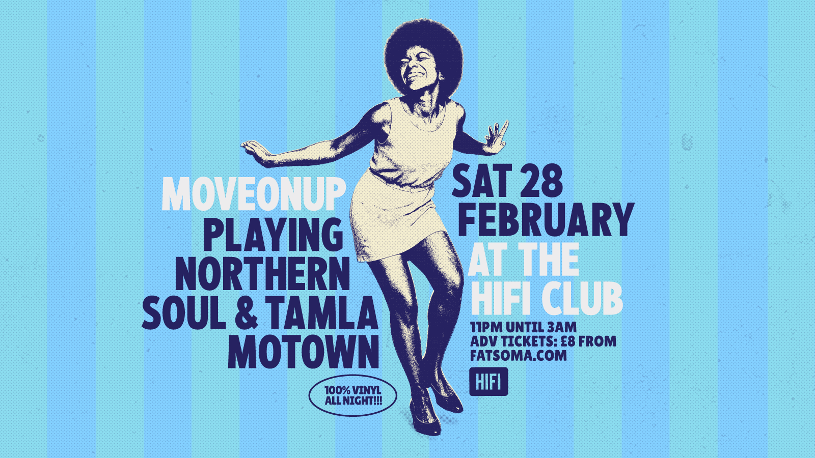 The amazing basement sixties and seventies soul party that is Moveonup first started attracting clubbers of Leeds to their weekly residency in 1995. With its blend of Tamla Motown, Northern Soul, sixties beat & smatterings of raw funk and disco, it became one of the UK’s longest running weekly clubnights. Expect to hear the sounds of Stevie Wonder, Aretha Franklin, The Supremes, Shirley Ellis, Marvin Gaye, Jackie Wilson, Etta James, Voices Of East Harlem, Eloise Laws, Edwin Starr, alongside the rarer soul sounds from the Northern scene.
