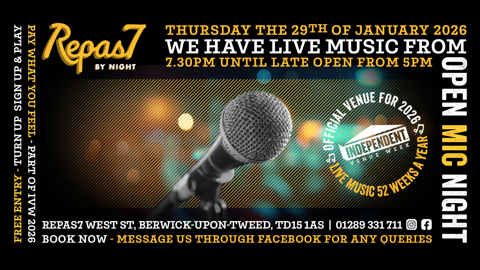 We're Hosting an Open Mic session and you're all invited - hosted and led by local musician, producer Iain Petrie whilst he's back home from being the bassist for Guitar Legend Albert Lee's band. Come along, sign up and play, sing or just enjoy.