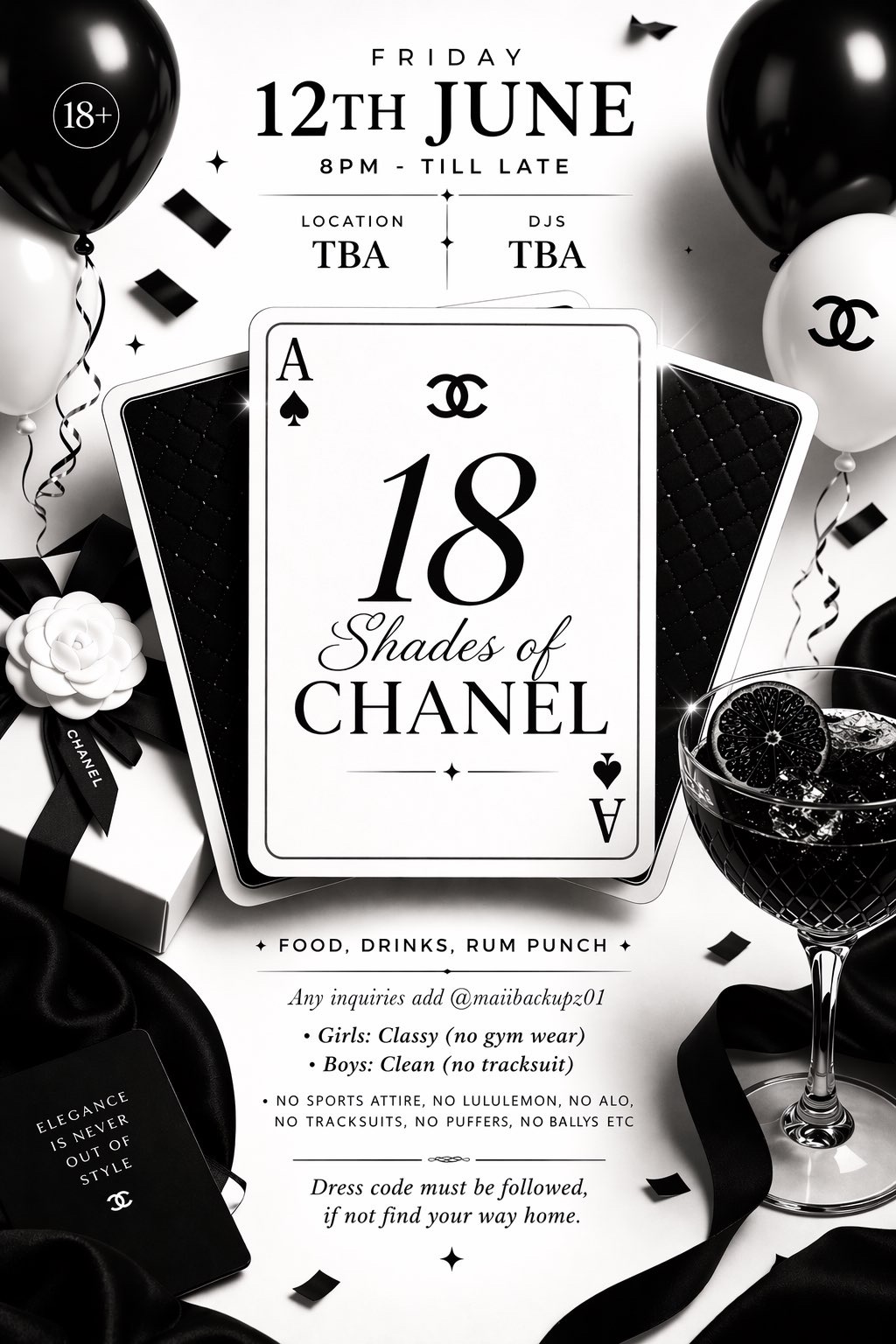 "18 Shades on Chanel" is London's premier formal party experience for those aged 18 and over . Doors close at 9:30 PM sharp, and entry requires a valid photo ID. Dress to impress —strictly no ballys or face coverings allowed. Enjoy a night of sophistication with cash and card payments accepted. Smoking and vaping are permitted only outside. Security personnel will ensure a safe environment, with prohibited items like knives and smart whip confiscated.