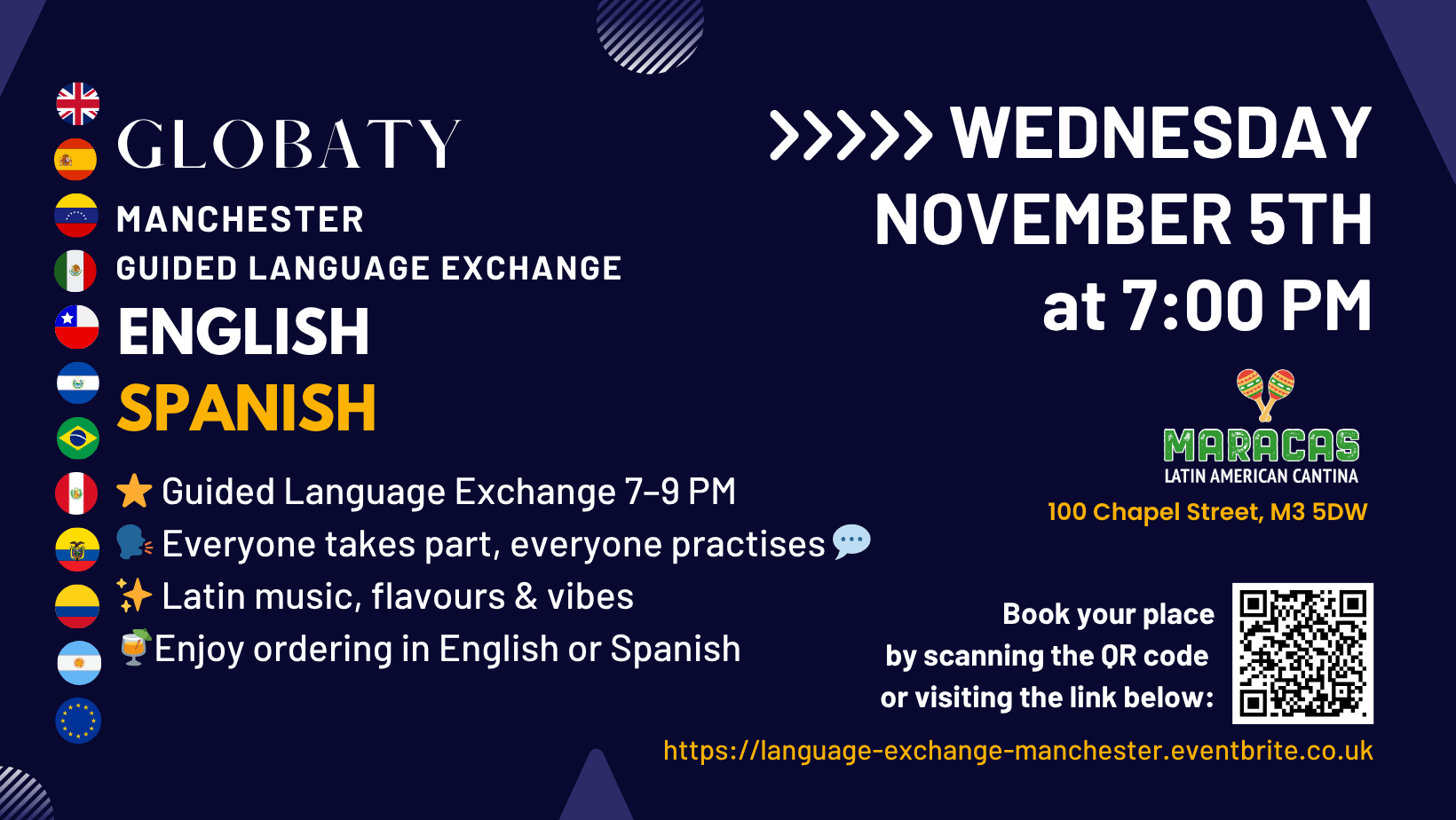 Join us on 5th November at 7pm for an evening of Language and Cultural Exchange 🇬🇧🇪🇸🇻🇪🇲🇽🇨🇱🇸🇻🇧🇷🇵🇪🇪🇨🇨🇴🇦🇷🇪🇺