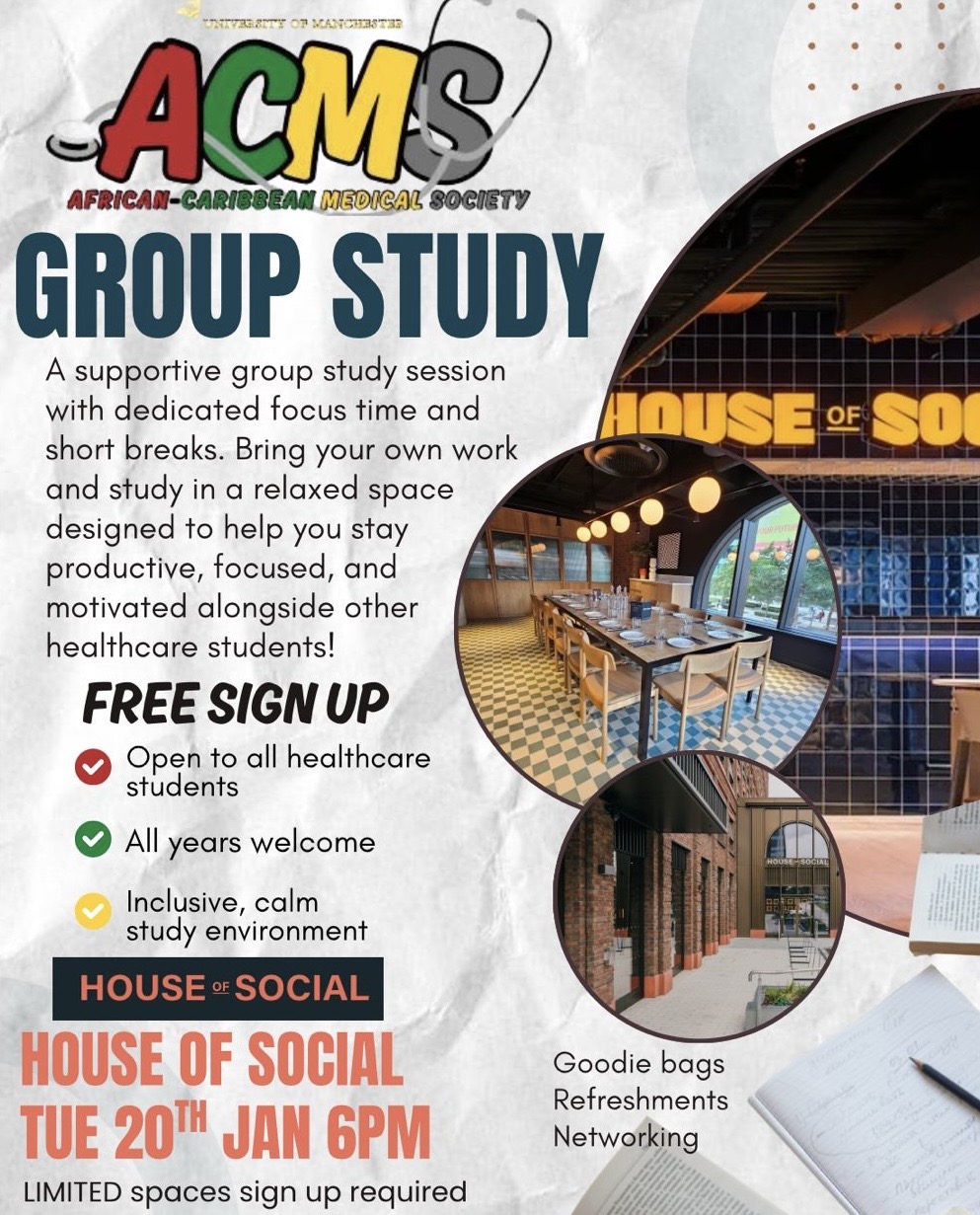 Hosted at the renowned House of Social, ACMS invites you to a supportive group study session on Tuesday 20th January from 6pm.