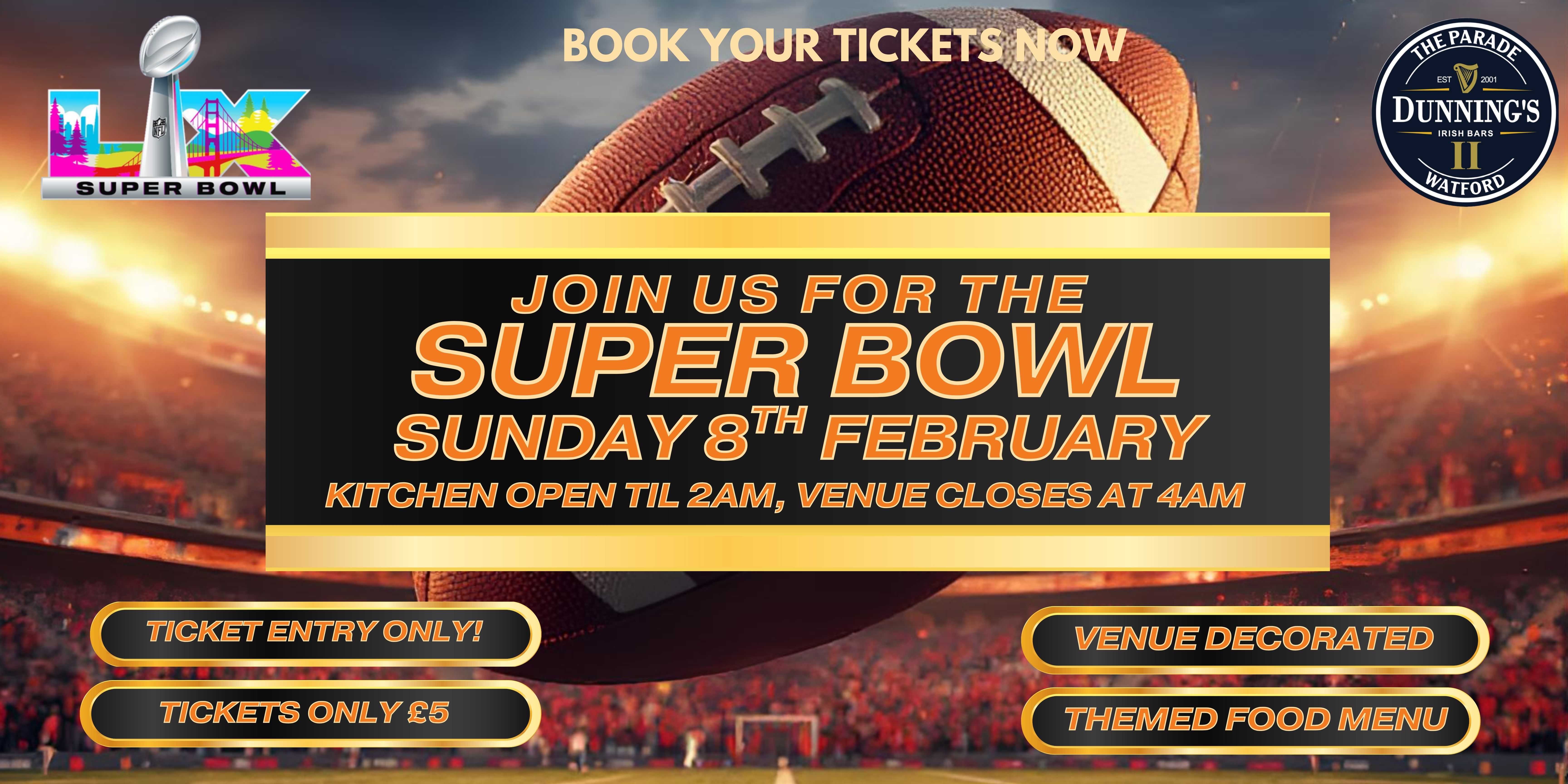 Tickets are limited, so book early and join us at Dunnings Sports Bar & Grill for Watford’s biggest Super Bowl celebration.