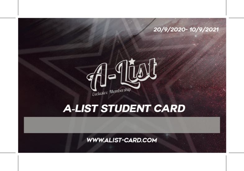 A-List Card is your survival card to Bournemouth. Without it, expect to pay a lot more for goods and services. A-List covers every major student friendly service in your location, for every category of business. Whether you’re looking for a nightclub, bar, pub, restaurant, fast food outlet, gym, hairdresser or even taxi to use, A-List covers all key players.