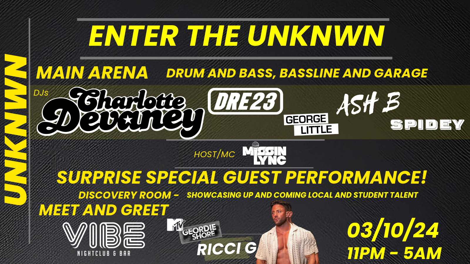 The energy will be electric, the atmosphere raw, and the crowd united by a shared love for music that challenges the norm. "ENTER THE UNKNWN" is where you come to lose yourself in the music and find something entirely new.