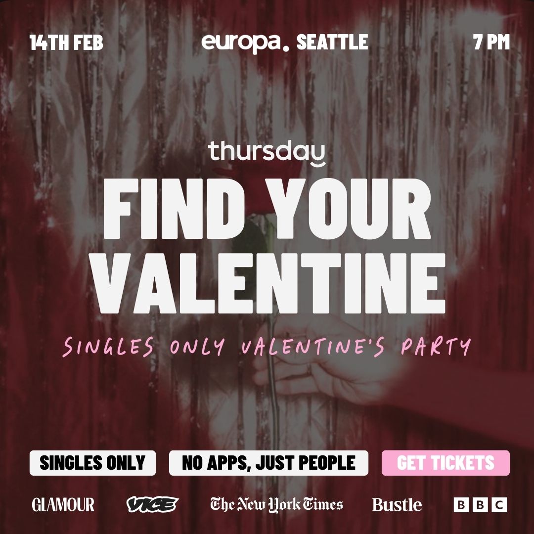 Weāre throwing a singles-only Valentineās party at Europa in Pioneer Square and itās all about flirting, dancing, and meeting someone cute in real life. Think candlelit vibes, low lights, cozy corners, a DJ setting the mood, Valentineās drink specials, and a room full of hot singles who are actually down to meet people.