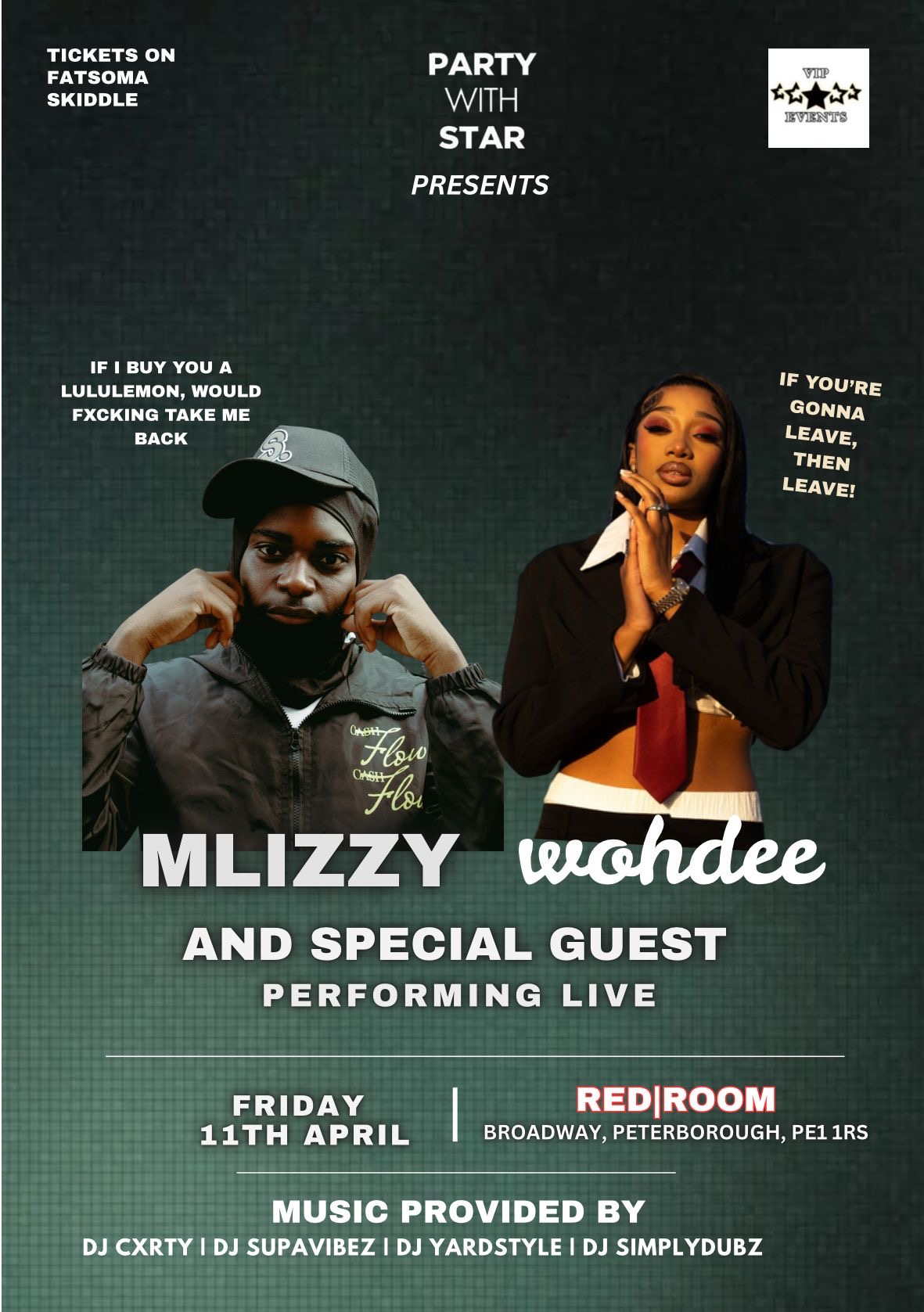 Partywithstar stars presents a big night of trending or hot with 2 of the biggest trending artists right now MLIZZY representing for the man dem and WOHDEE representing for the ladies