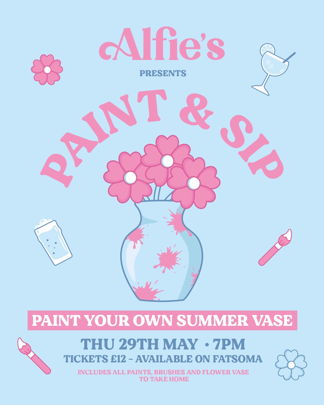 Paint, brushes and vase all provided in your ticket price, the best drinks offers in town and Alfie’s fried chicken served till 9.30! And two for £10 cocktails!