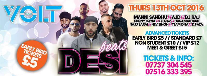 ► DESI BEATS @ VOLT CLUB ► THURSDAY 13TH OCTOBER ►Desi Beats is back bringing you the biggest artists and djs at the most sought out late night venue Volt Club Nottingham✖ EARLY BIRD TICKETS £5 ✖ CONTACT: 07737 304545 ✖ ✖ EARLY BIRD TICKETS £5 ✖ CONTACT: 07737 304545 ✖ ✖ EARLY BIRD TICKETS £5 ✖ CONTACT: 07737 304545 ✖► Main room: Bhangra // Desi Beats► Manni Sandhu► AJD