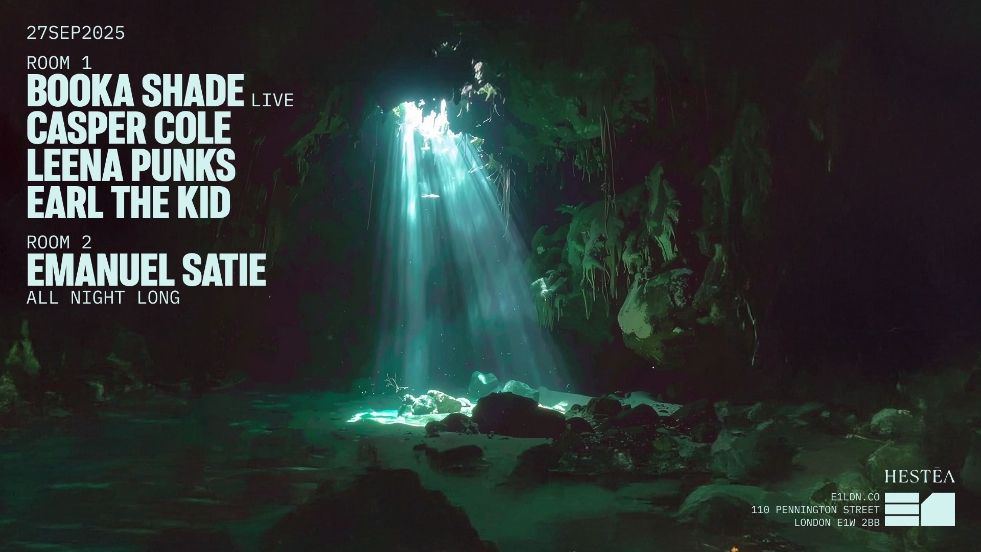 Live electronica drifts back into the warehouse. Booka Shade return to E1. Emanuel Satie steps up to room 2 for an all night long set.