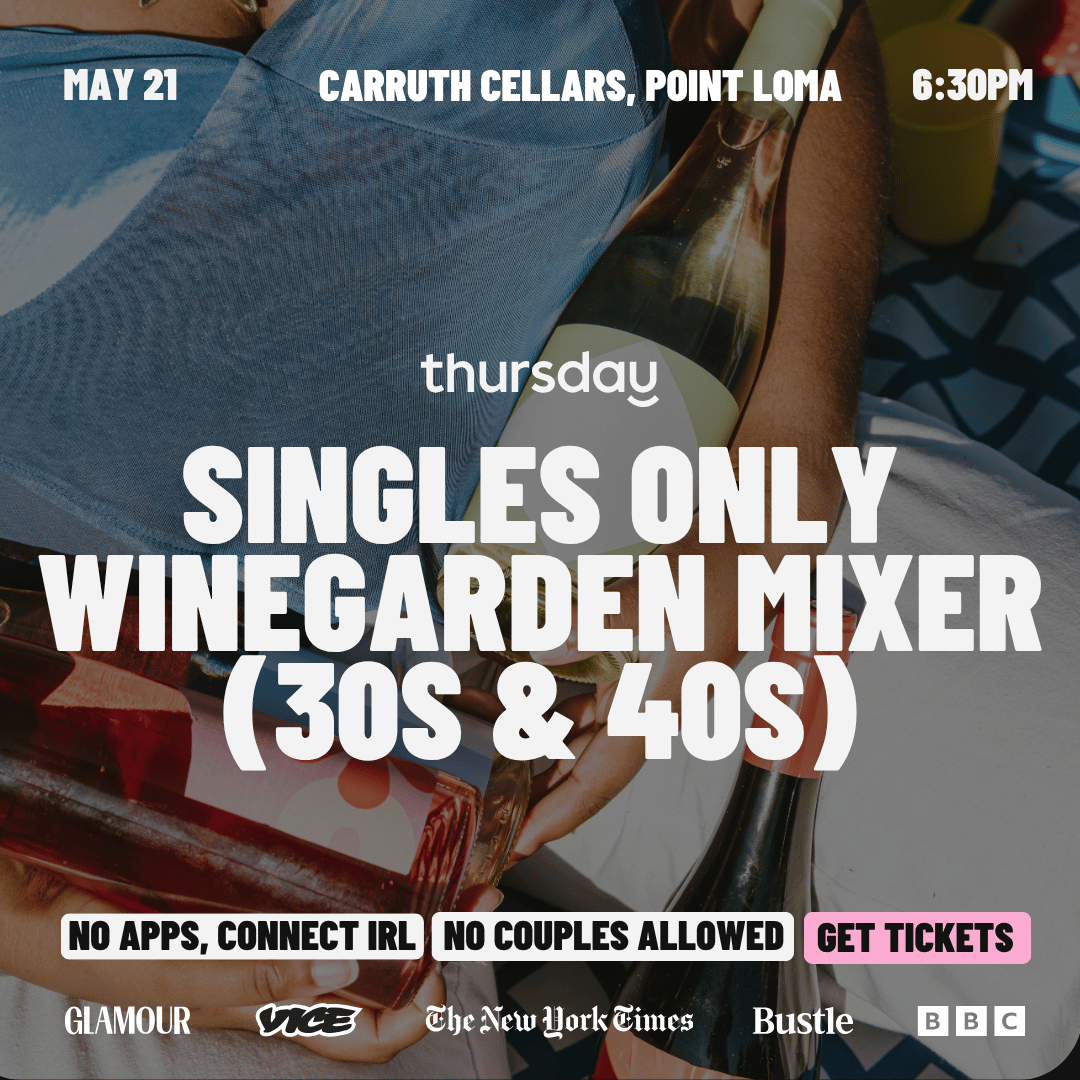 Hey there San Diego! Meet us Thursday May 21 at Carruth Cellars in Point Loma for a singles mixer, ages 30-49! Join us in their urban wine garden filled with a bunch of Thursday Dating attendees! Come and enjoy some of the best wine and cheese in town, while getting to meet someone new!
