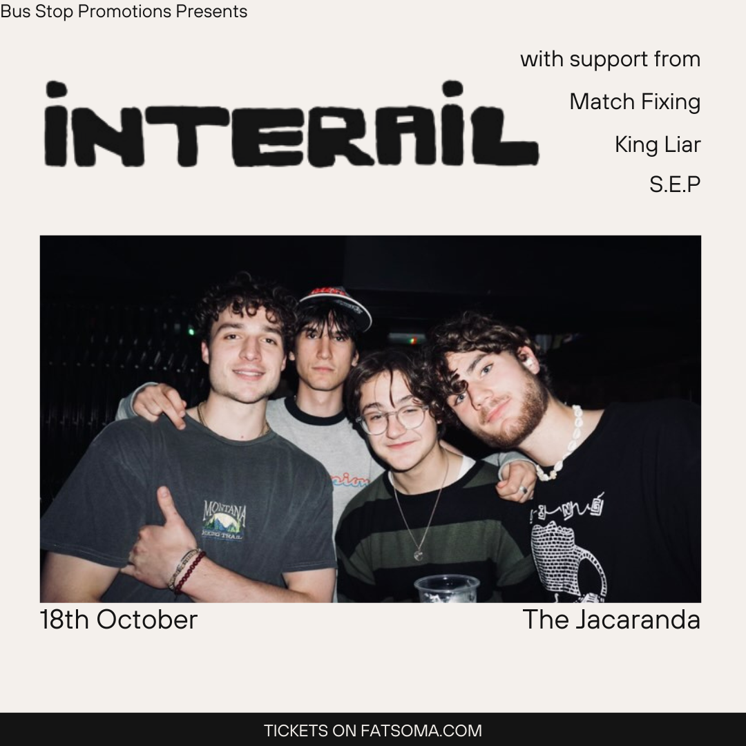 Alt rock giants, Interail, take over Slater Street to headline the iconic Jacaranda Basement. Joined on support by the incredible Match Fixing, King Liar and Space Exploration Project.